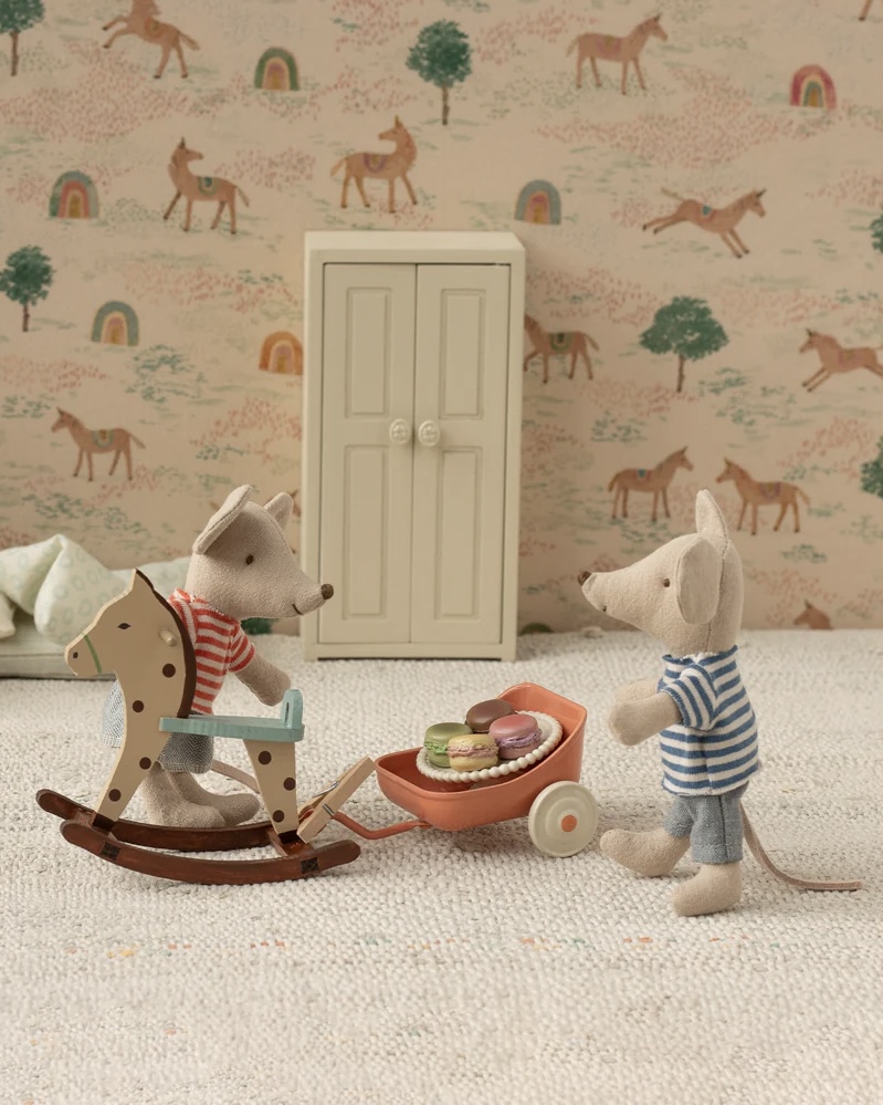 L’armoire Souris Maileg rose léger est un indispensable du mobilier miniature. Conçue en bois, elle permet à la famille souris de ranger soigneusement vêtements et accessoires tout en apportant une touche décorative délicate à la maison.