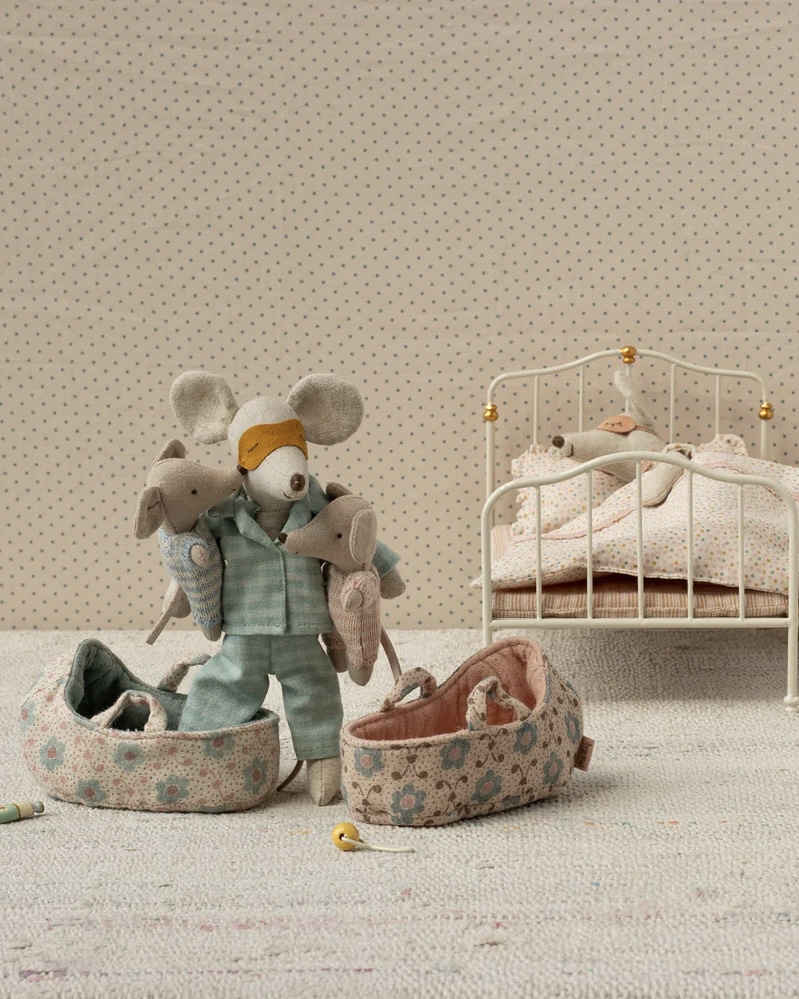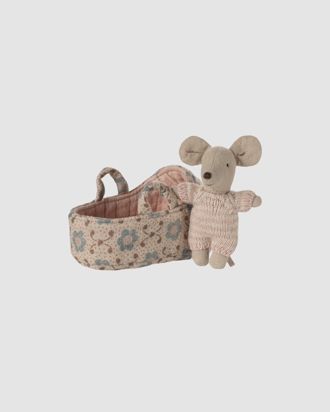 La Bébé Souris dans son Couffin Rose Maileg incarne tout l’esprit poétique et délicat de la marque danoise. Avec son pull tricoté et son couffin aux motifs fleuris, elle devient vite un compagnon de jeu incontournable pour les enfants.