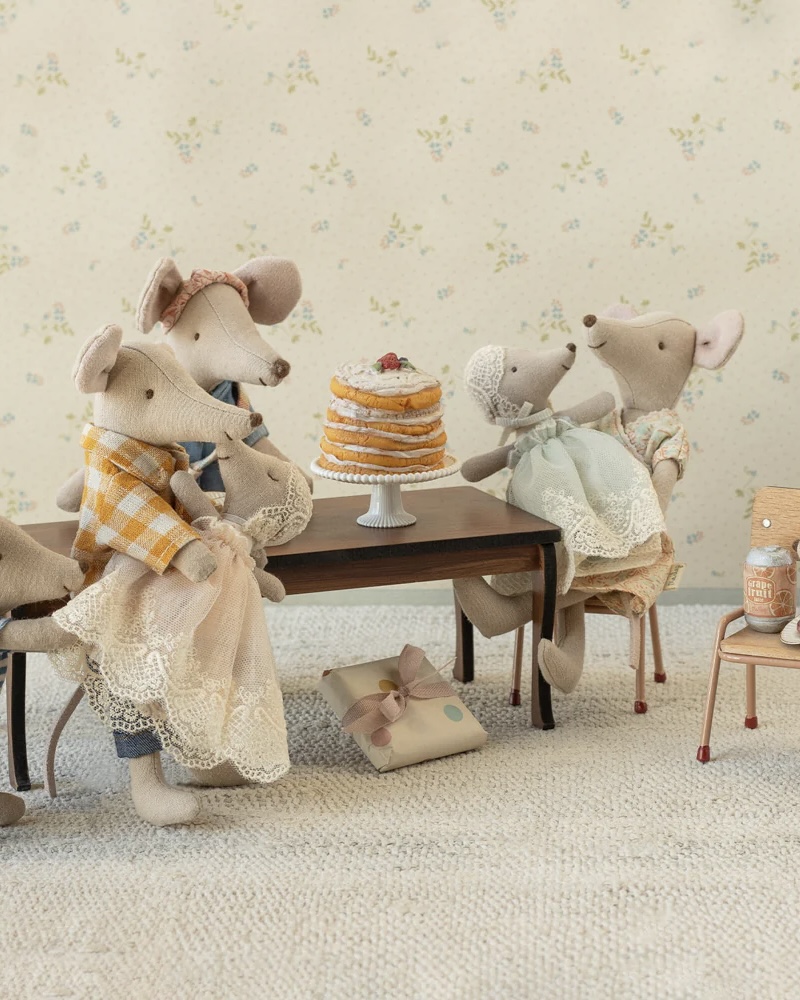 Le bébé souris Maileg en robe poudre incarne toute la tendresse de l’univers de la marque. Habillée d’une robe légère aux finitions raffinées, elle porte également une jolie coiffe en dentelle. Ainsi, elle évoque une scène douce et élégante, idéale pour des moments de célébration imaginaires.