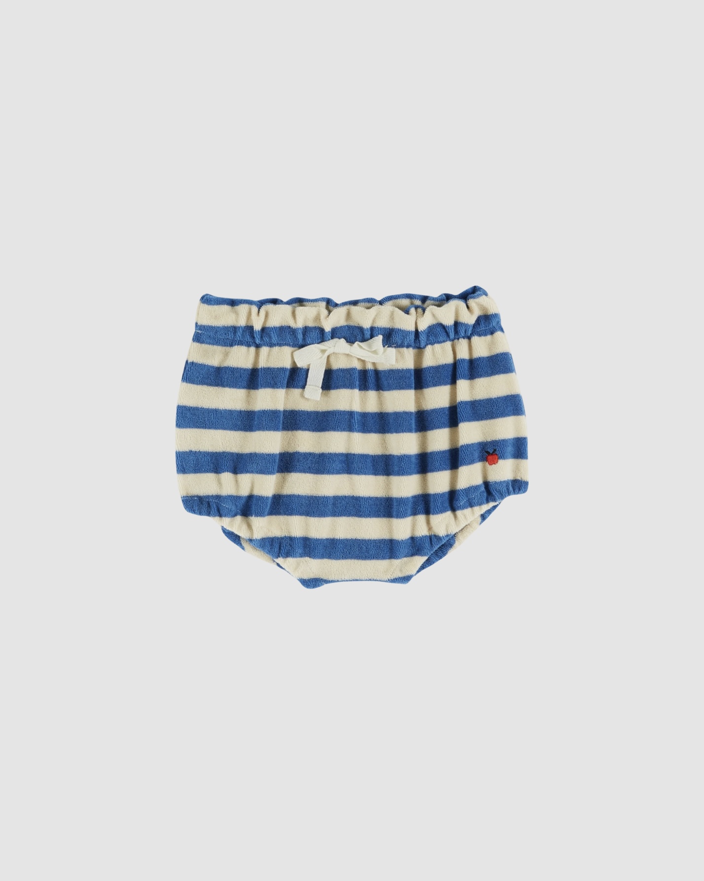 Ses rayures bleues et écrues apportent une note fraîche et intemporelle. De plus, la texture éponge renforce l’aspect moelleux du modèle. Ce bloomer s’intègre facilement dans le vestiaire d’été des tout-petits.