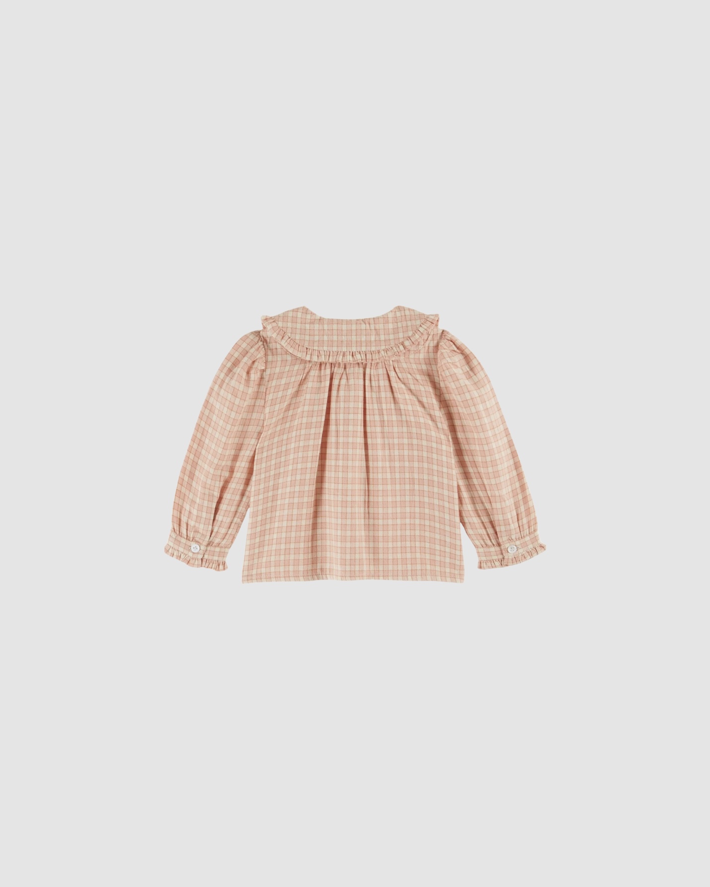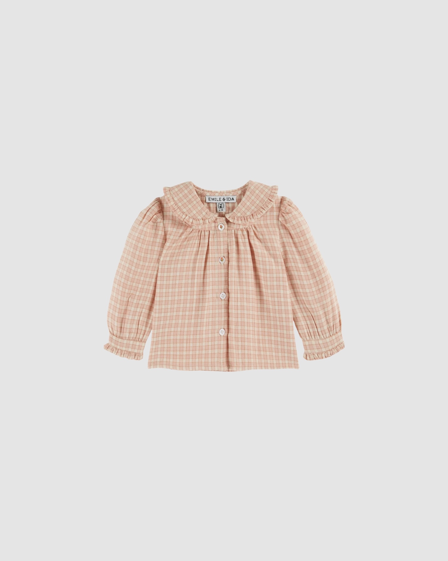 La blouse écolière col nœud rose Émile et Ida est confectionnée dans un coton doux à carreaux. Sa coupe évasée et son col Claudine volanté offrent un style tendre, élégant et confortable pour les enfants.