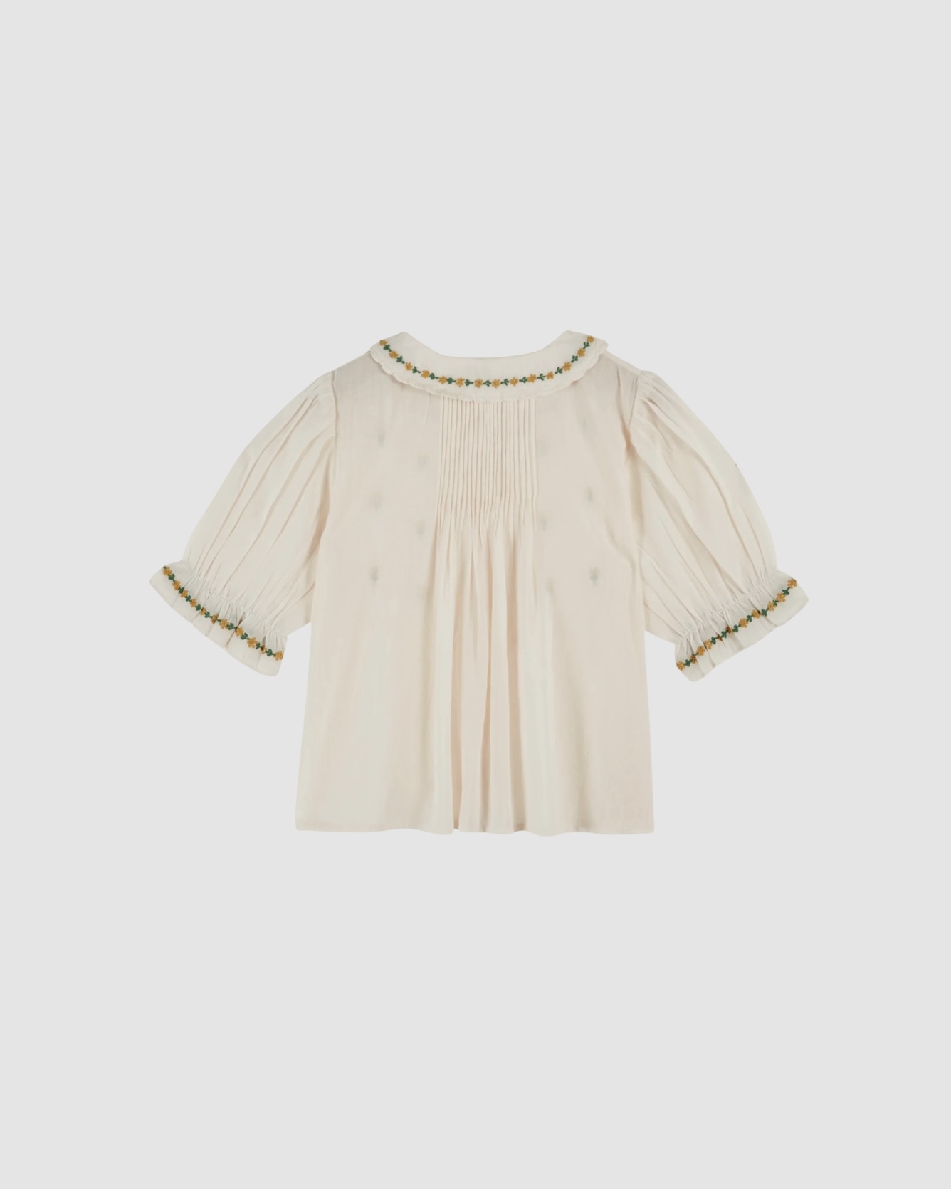 Tout d’abord, le col Claudine festonné est souligné d’une guirlande de fleurs brodées qui apporte une touche raffinée sans alourdir la silhouette. De leur côté, les manches ballon élastiquées reprennent ce travail de broderie afin de créer une finition harmonieuse. Ainsi, grâce à l’ouverture boutonnée sur toute la hauteur, l’habillage devient simple et rapide au quotidien. Par ailleurs, les plis couchés sur le devant et dans le dos structurent la blouse tout en conservant un tombé fluide. Enfin, les coutures anglaises assurent des assemblages solides et confortables, parfaitement adaptés aux mouvements des enfants.