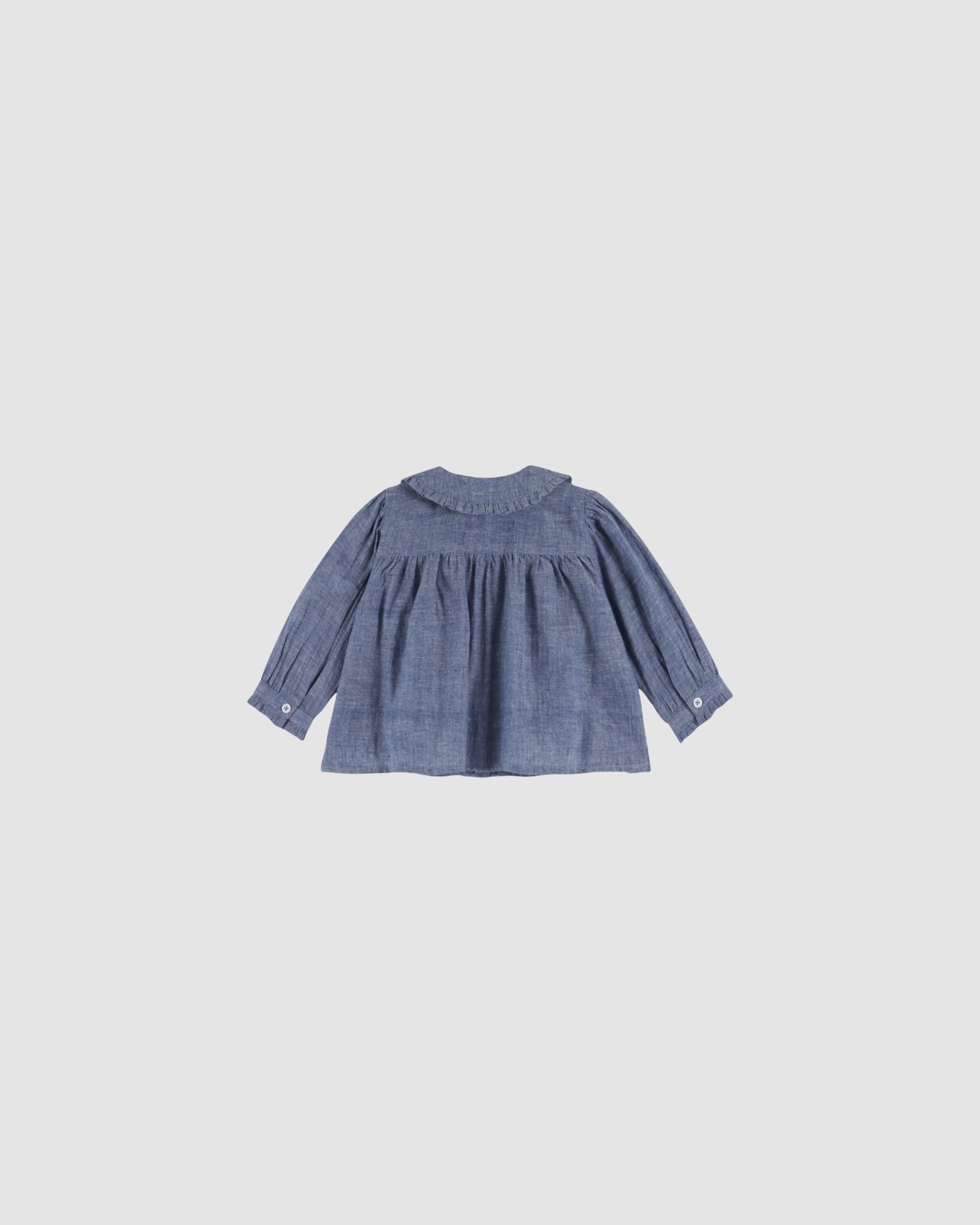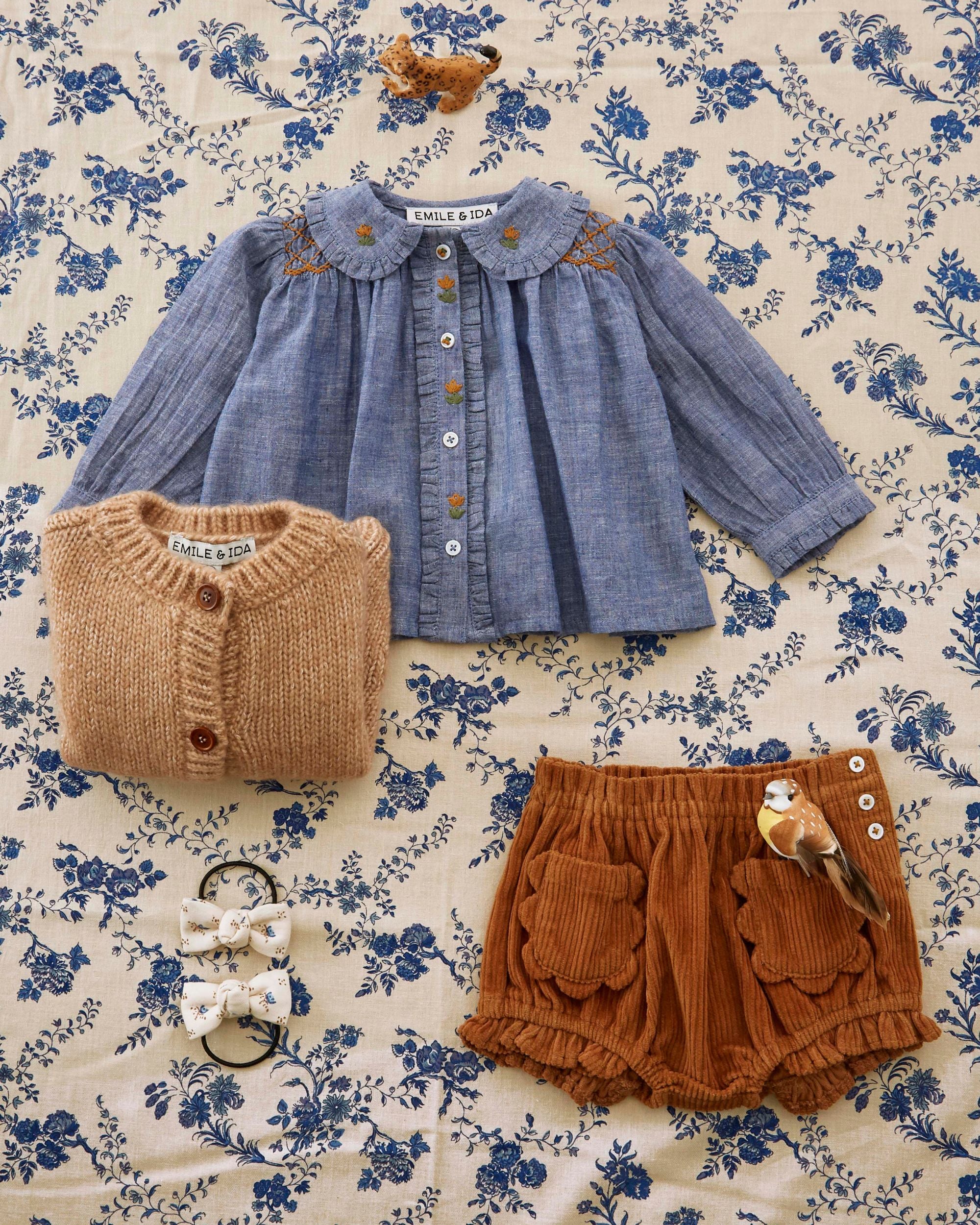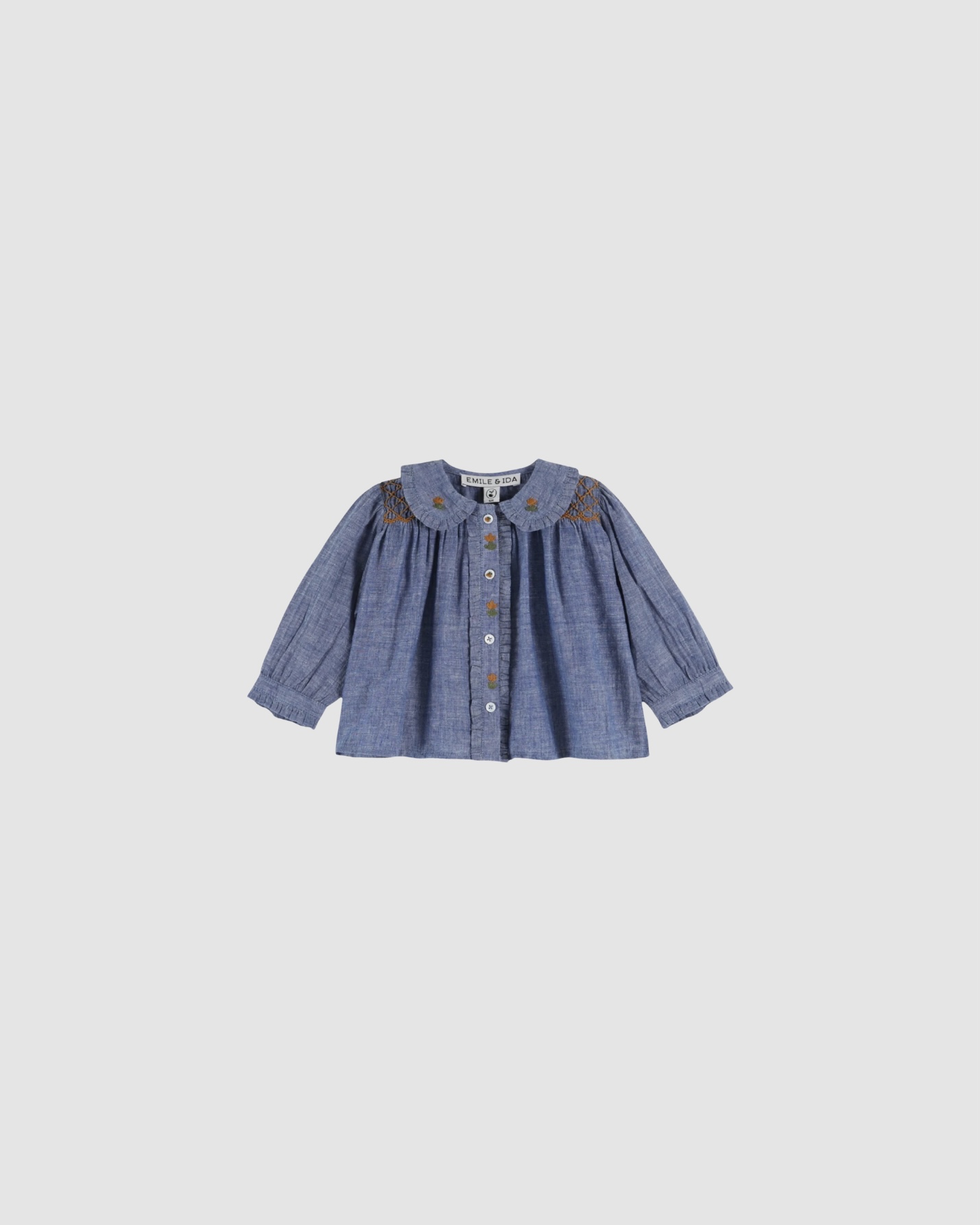 La blouse smockée chambray Émile et Ida offre un style délicat et intemporel pour bébé. Sa coupe ample, ses smocks faits main et son col Claudine brodé en font une pièce élégante et confortable du quotidien.