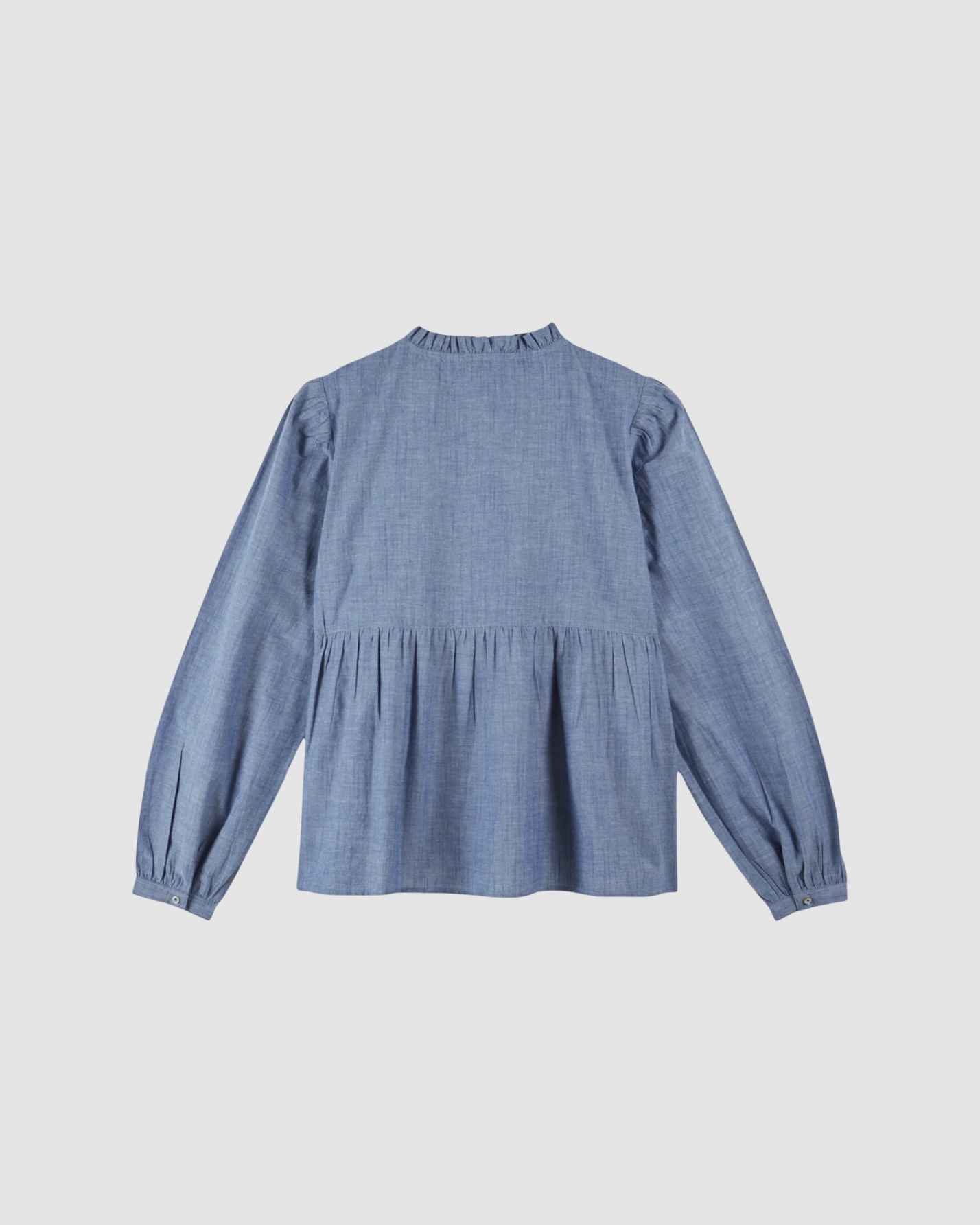 La fermeture se fait par de véritables boutons en nacre naturelle, dissimulés sous une patte volantée. Ainsi, la ligne de la blouse reste fluide et élégante. Les manches longues, légèrement froncées aux poignets et terminées par un bouton, complètent la silhouette avec douceur.