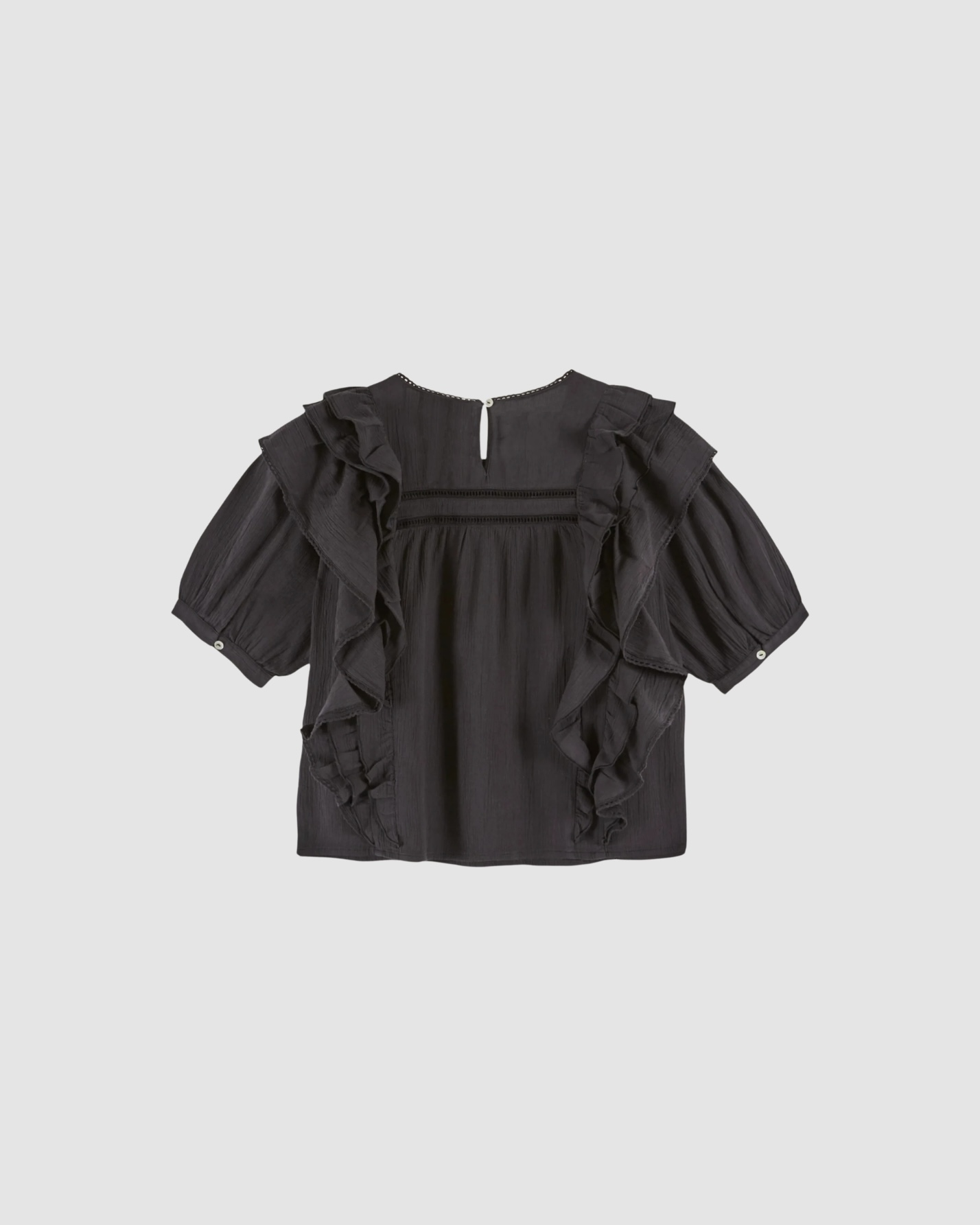 Le volume délicat de cette blouse est créé par trois rangées de volants disposées à l’avant et au dos. Ces détails apportent du mouvement à la silhouette tout en conservant une allure fluide. L’encolure ronde souligne la simplicité de la coupe, tandis que les lignes de dentelle ajourée ajoutent une touche subtilement romantique.