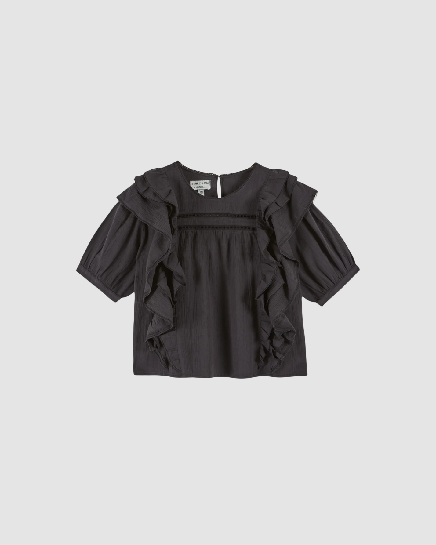 La Blouse volantée noire Émile et Ida est une pièce féminine qui associe légèreté, élégance et savoir-faire textile. Confectionnée en gaze de coton, elle offre une texture douce et respirante, idéale pour accompagner les saisons avec confort.