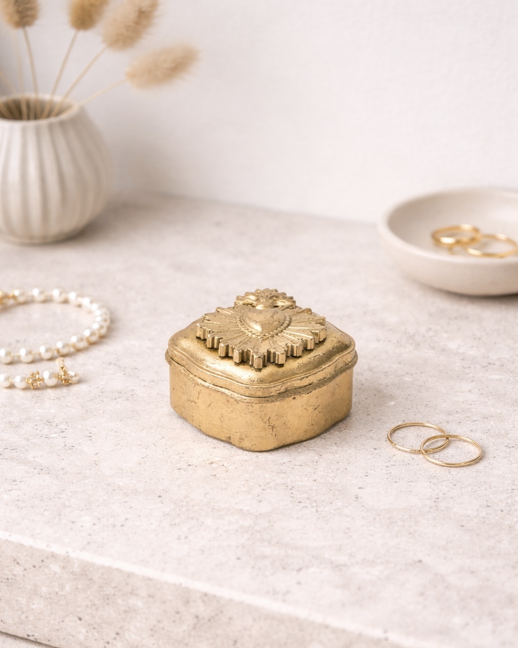 Sa finition dorée volontairement patinée lui donne un aspect ancien très chaleureux. Ainsi, cette petite boîte décorative semble avoir traversé le temps. Elle trouve naturellement sa place sur une console, une table de chevet, une étagère ou un bureau.