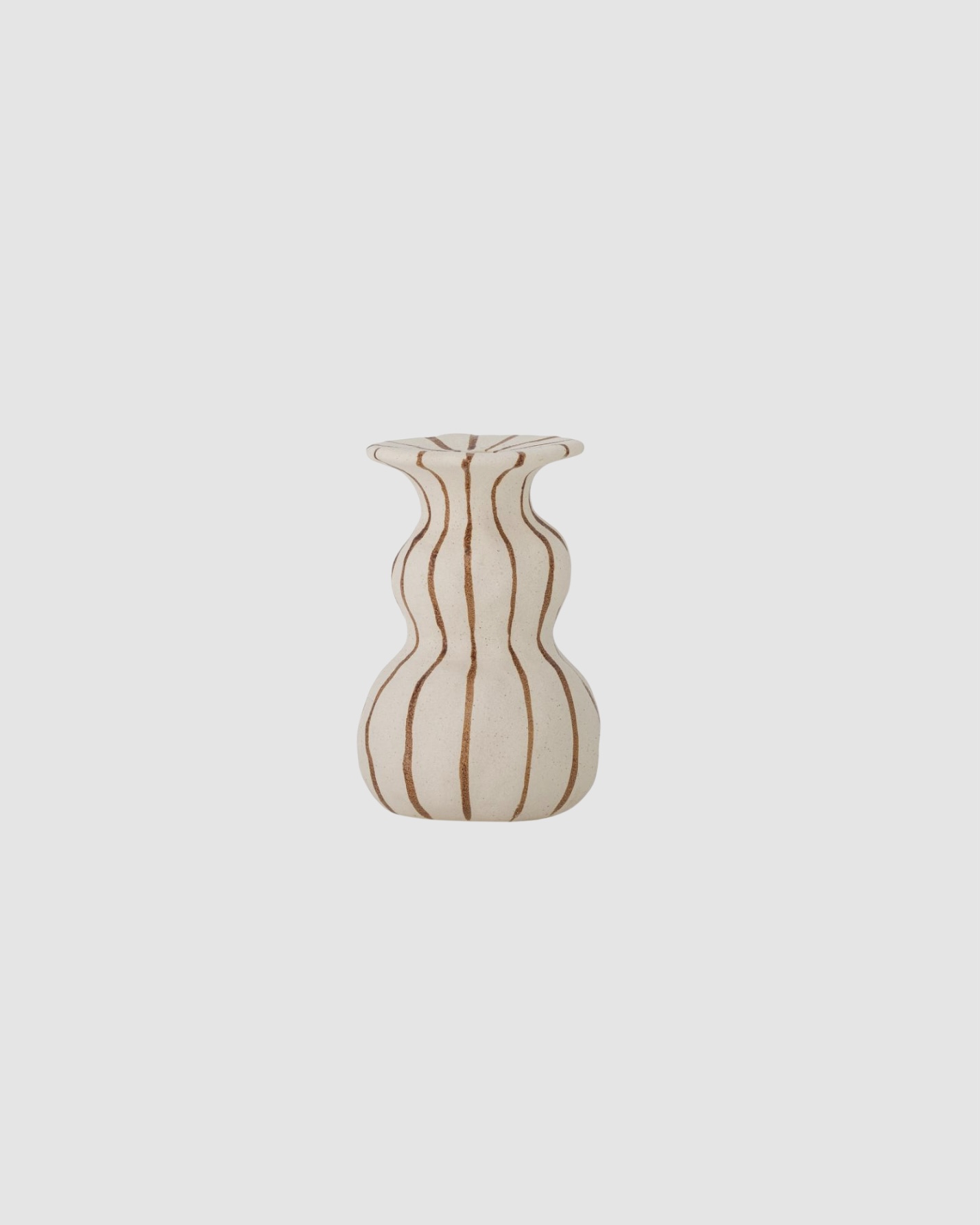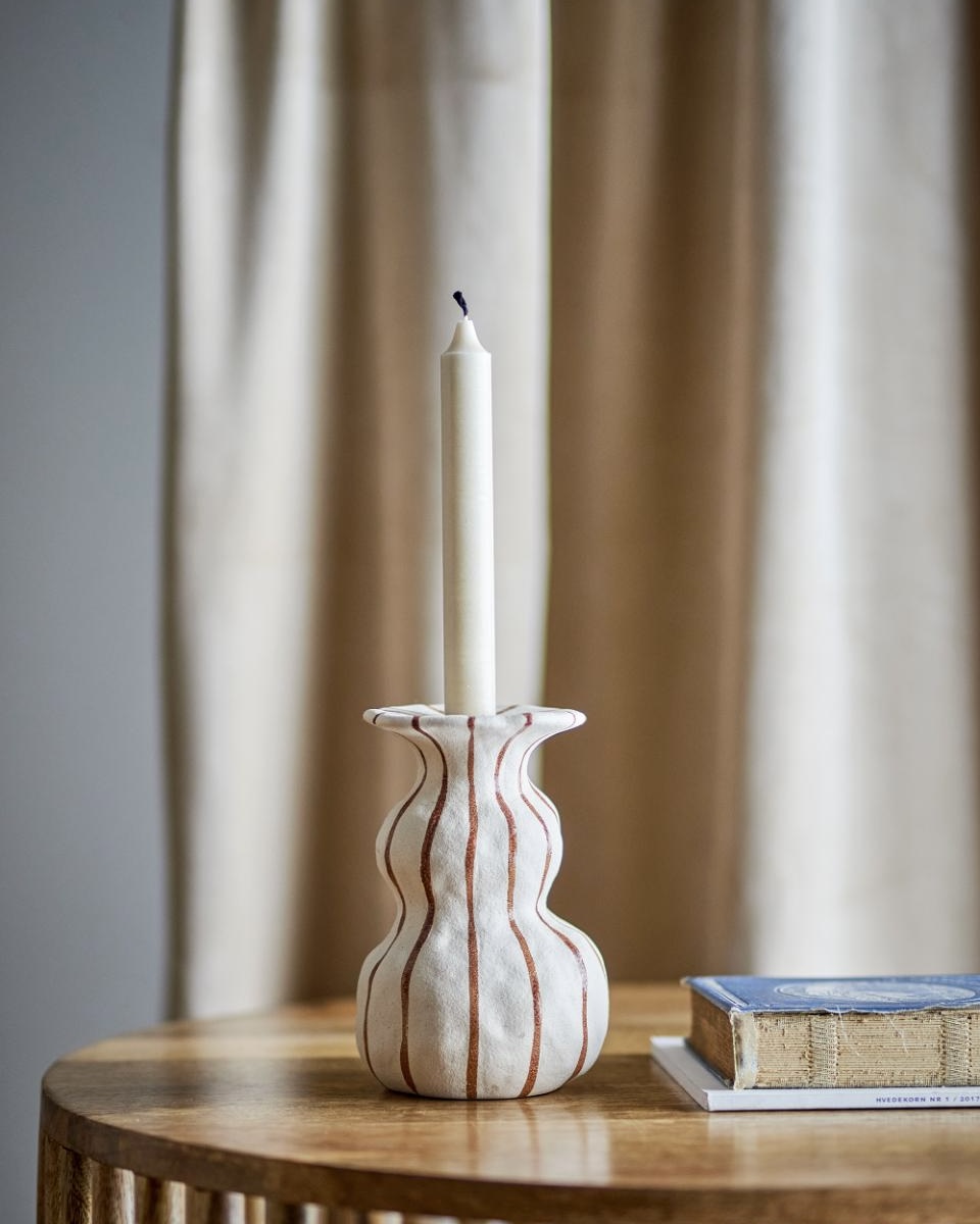 Le bougeoir Byron Bloomingville est une pièce décorative qui attire immédiatement le regard. Sa silhouette en sablier lui apporte une allure élégante et organique. De fines rayures brunes ondulent sur un fond beige doux, créant un contraste subtil et chaleureux. Ce bougeoir s’intègre naturellement dans un intérieur à l’esprit cottage, bohème ou contemporain.