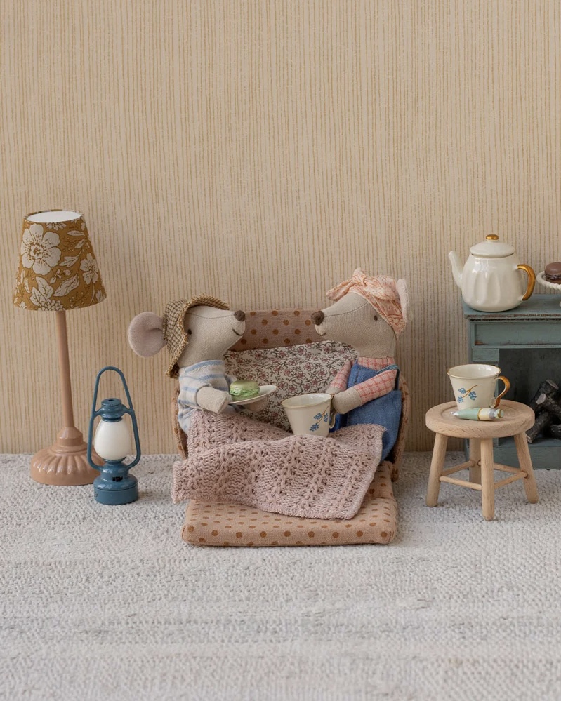 Le canapé-lit Souris Maileg à pois est un accessoire miniature ingénieux qui se transforme facilement en lit. Parfait pour compléter la maison des souris Maileg avec confort et poésie.