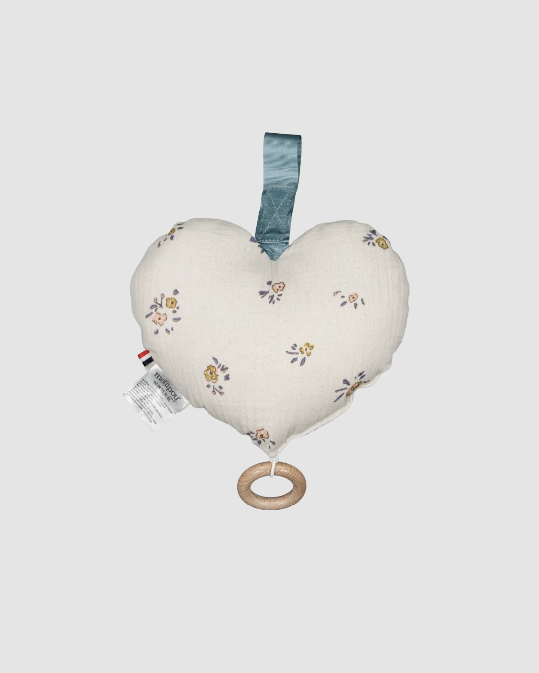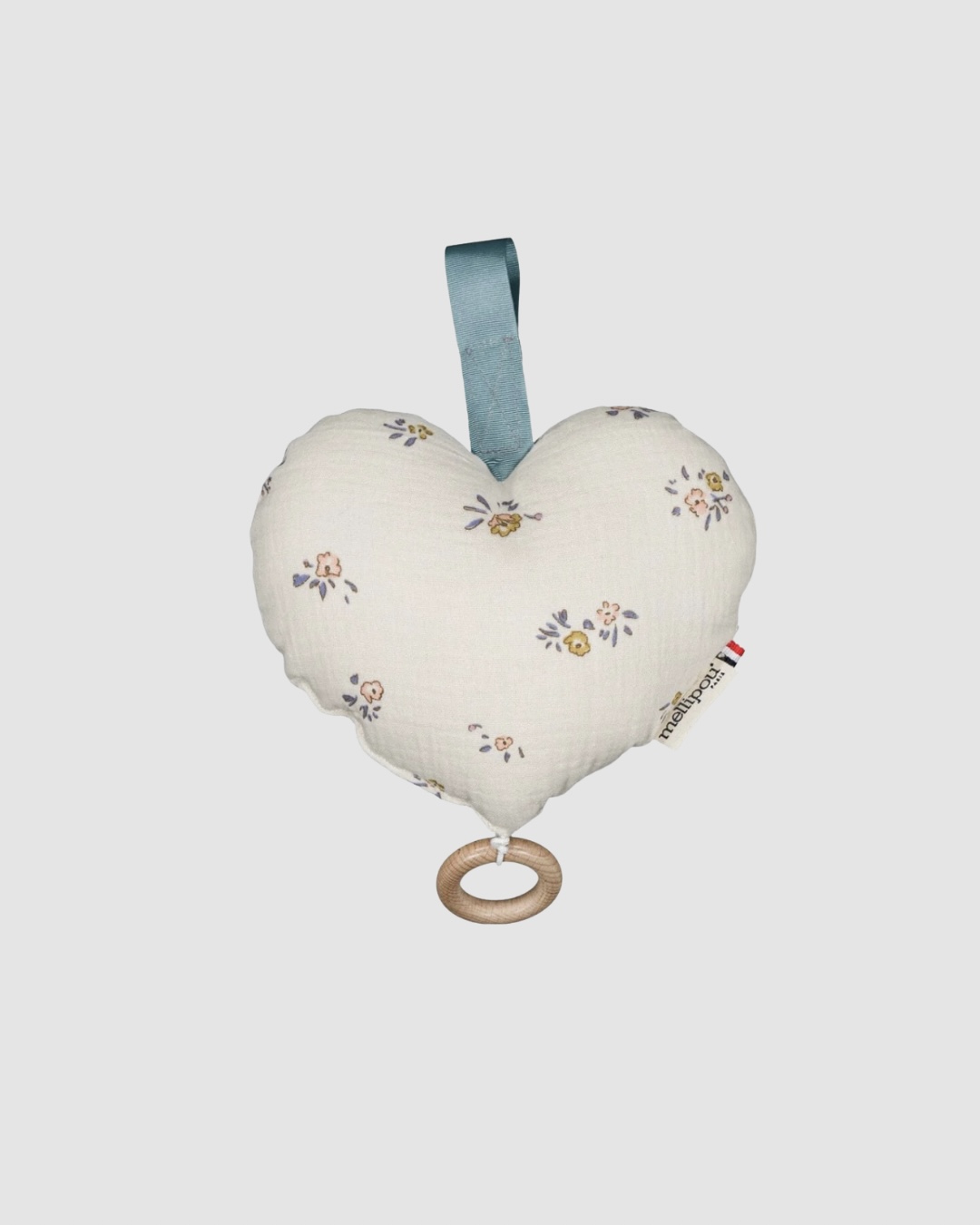 Le cœur musical Angèle Mellipou est un concentré de tendresse et d’élégance. Entièrement fabriqué en France, il incarne à la fois le savoir-faire artisanal et l’amour du détail propre à la marque Mellipou. Son tissu en mousseline de coton, orné de petites fleurs délicates, apporte une touche poétique à la chambre de bébé.