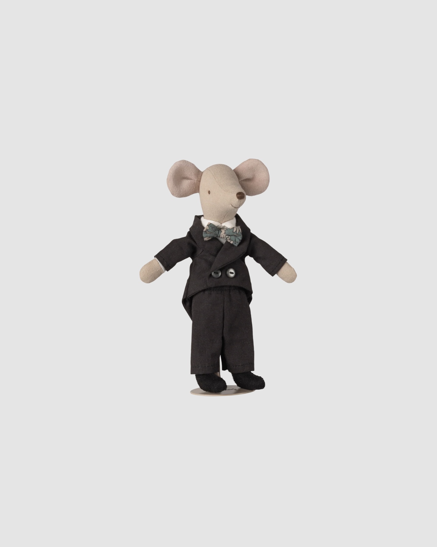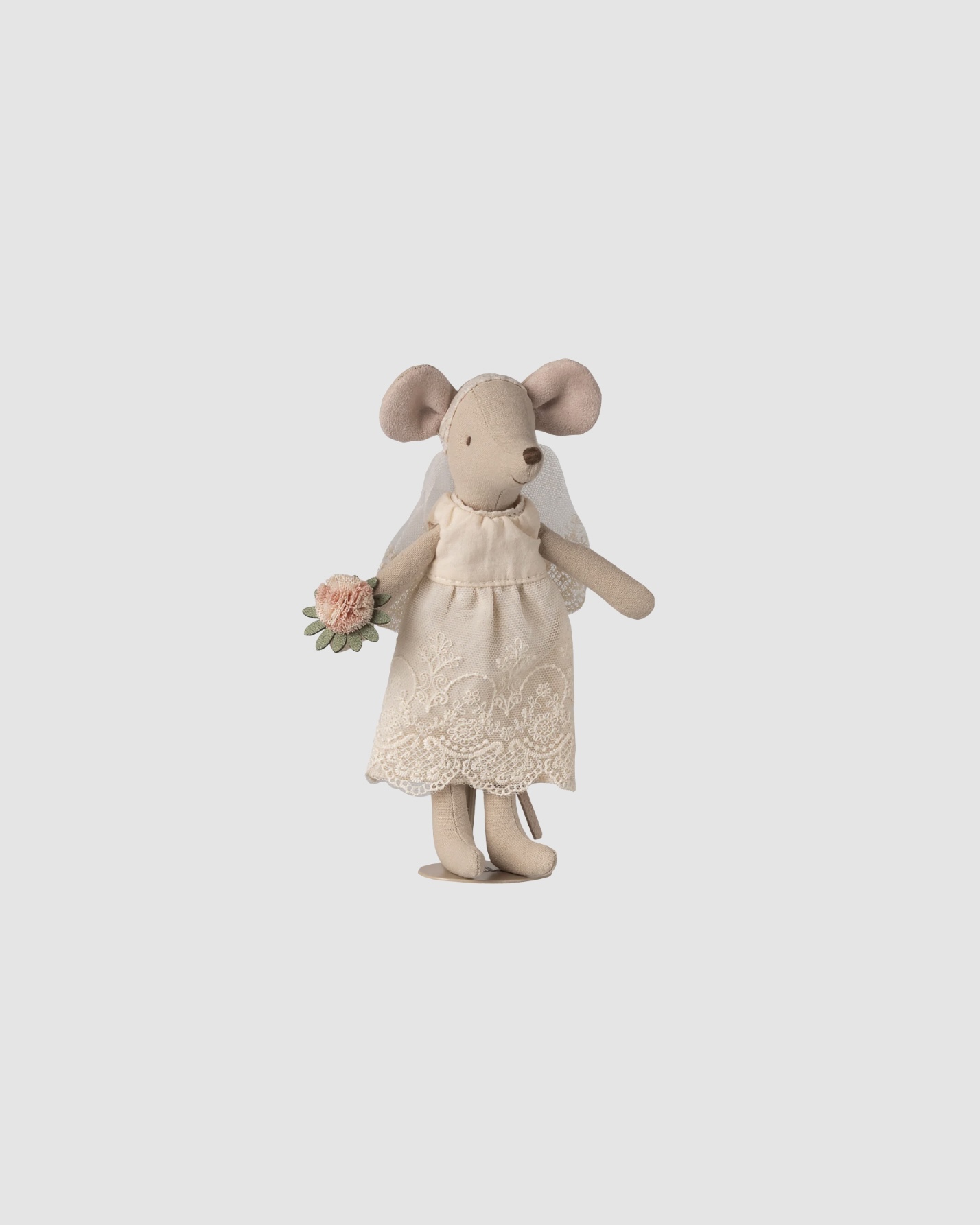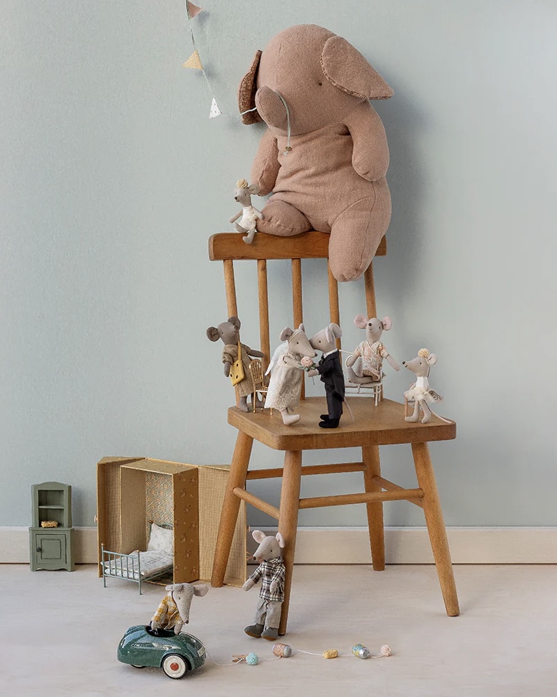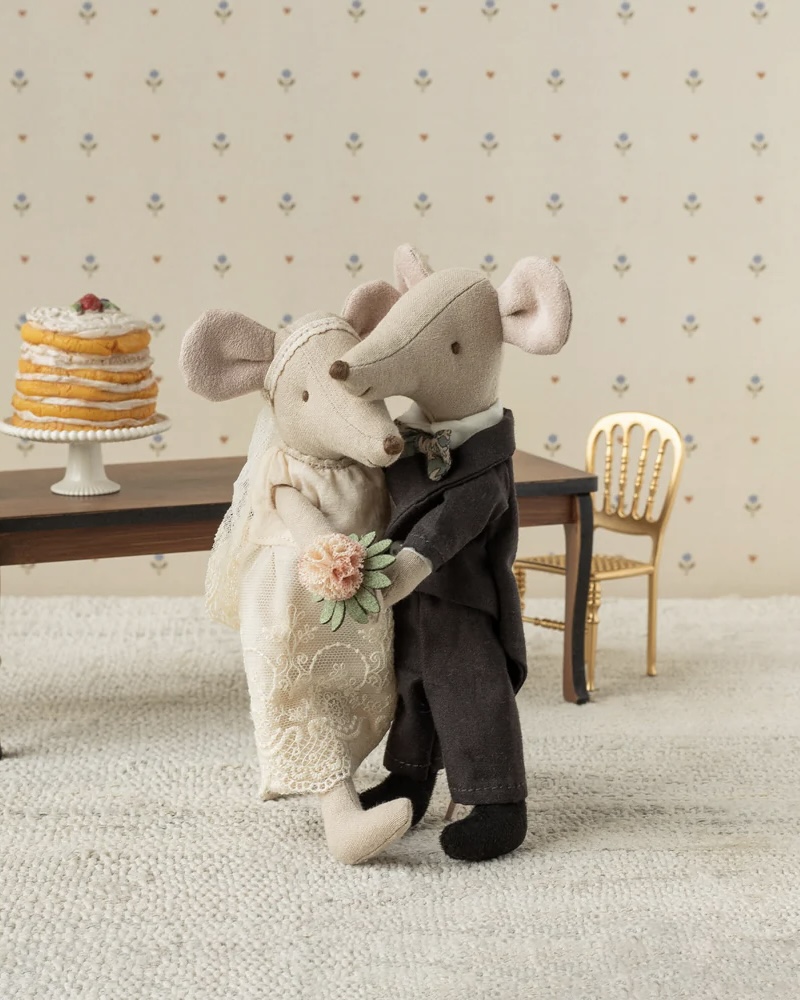 Le couple de mariés Maileg Maman & Papa est une véritable invitation à l’imaginaire. La mariée porte une robe blanche délicate, ornée de jolis détails, ainsi qu’un voile fin et un bouquet raffiné. De son côté, le marié affiche une élégance intemporelle avec son smoking parfaitement coupé. Ensemble, ils forment un duo harmonieux qui évoque une scène de mariage tendre et poétique.