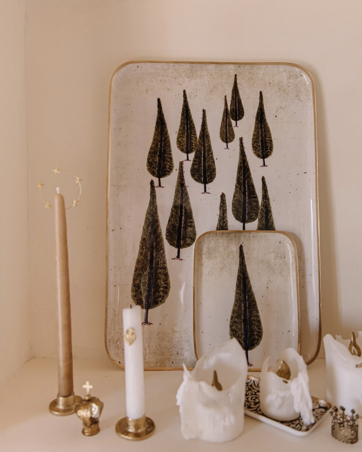 Le demi plateau Cyprus Boncoeurs est une pièce décorative et fonctionnelle, sélectionnée pour son motif Cyprus iconique, immédiatement reconnaissable. Son illustration végétale graphique apporte une atmosphère apaisante et sophistiquée, fidèle à l’univers poétique de la marque.