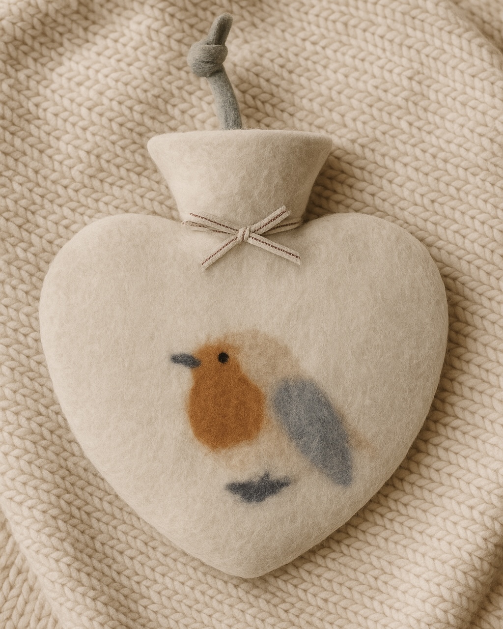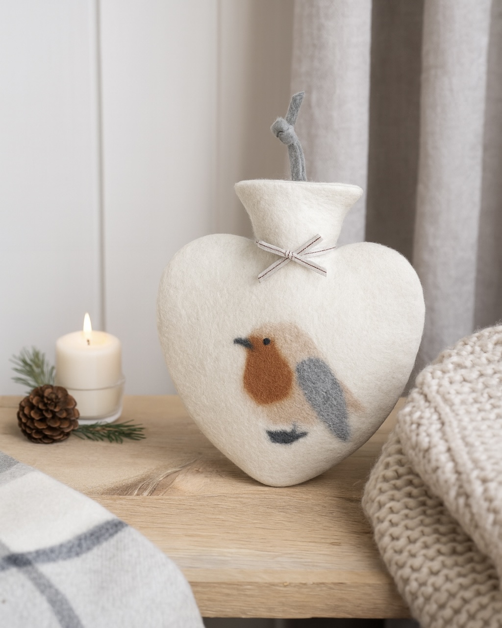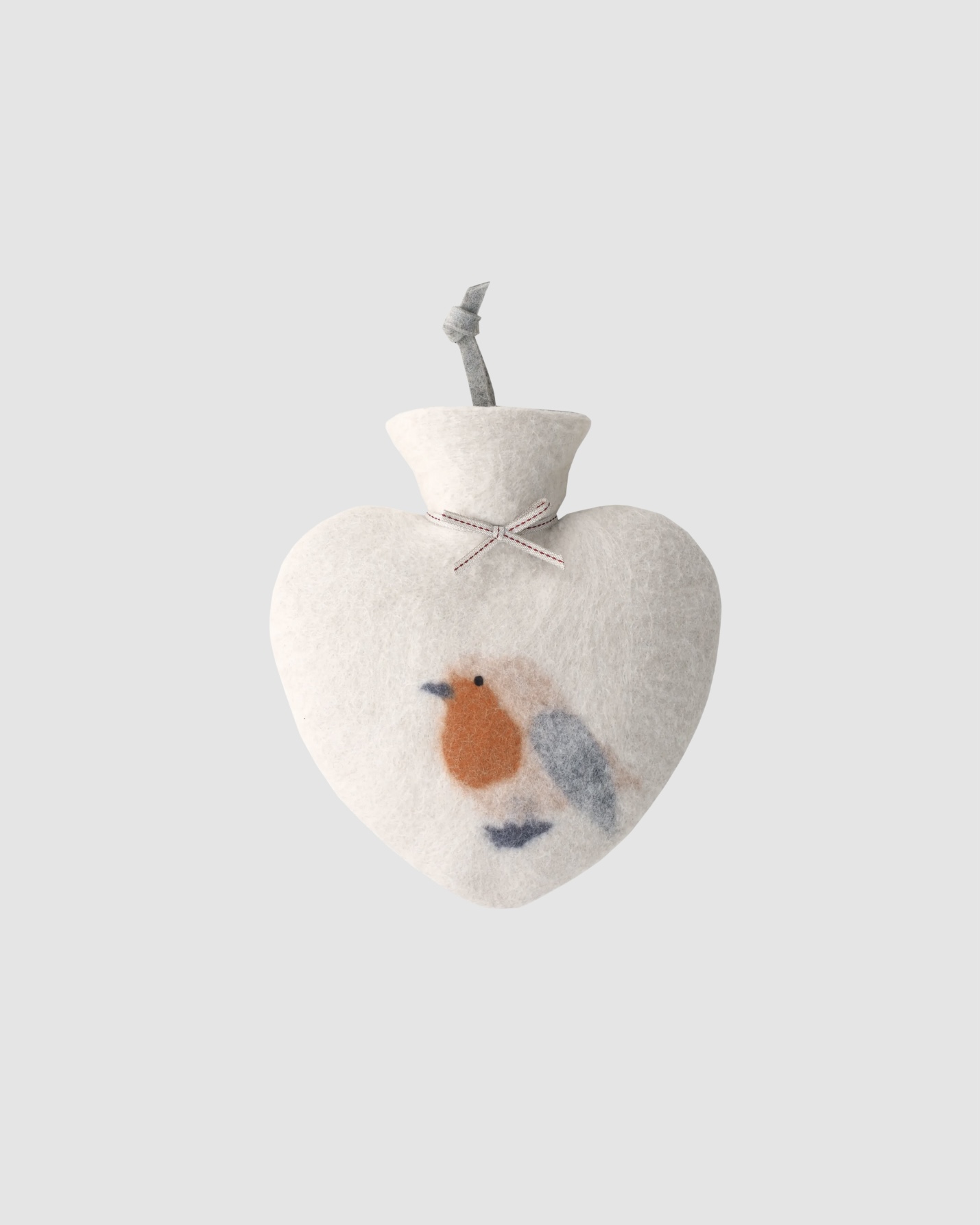 La grande bouillotte cœur Dorothee Lehnen est pensée pour offrir un confort immédiat. Grâce à sa laine feutrée douce et à sa forme enveloppante, elle diffuse une chaleur régulière qui détend le corps. Son motif rouge-gorge, appliqué à la main, renforce son charme artisanal. Par ailleurs, son coloris Peyote s’accorde facilement à tous les intérieurs.
