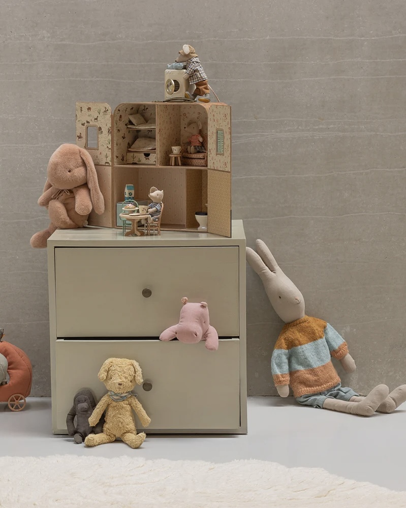 La Maison SuitCasa accueille les meubles et accessoires de l’univers Maileg, ajoutés progressivement selon les envies. Cette modularité encourage le jeu libre et stimule l’imagination à travers des scénarios inspirés du quotidien.