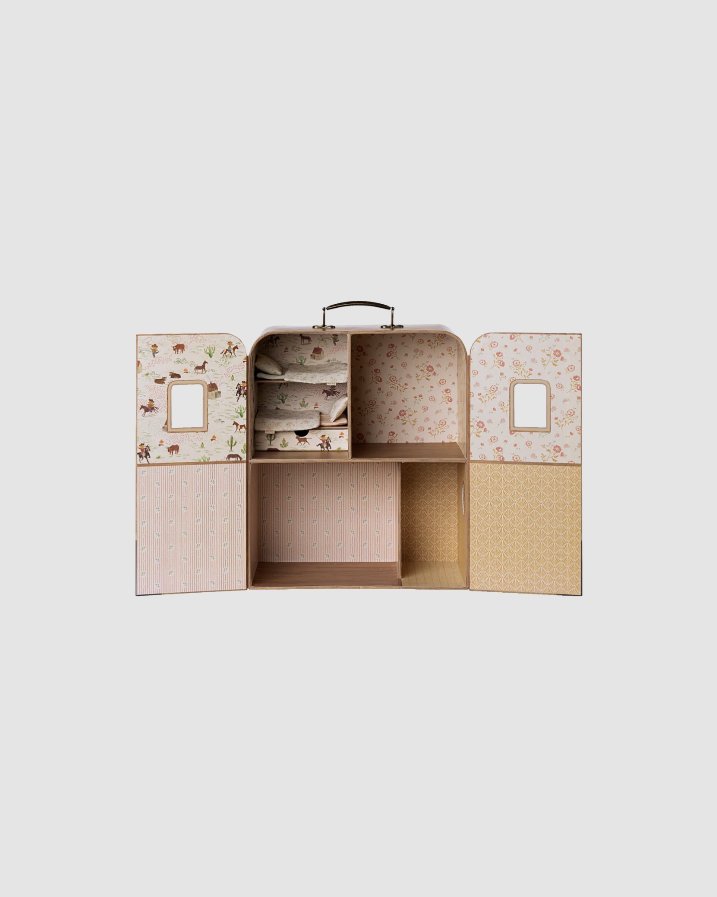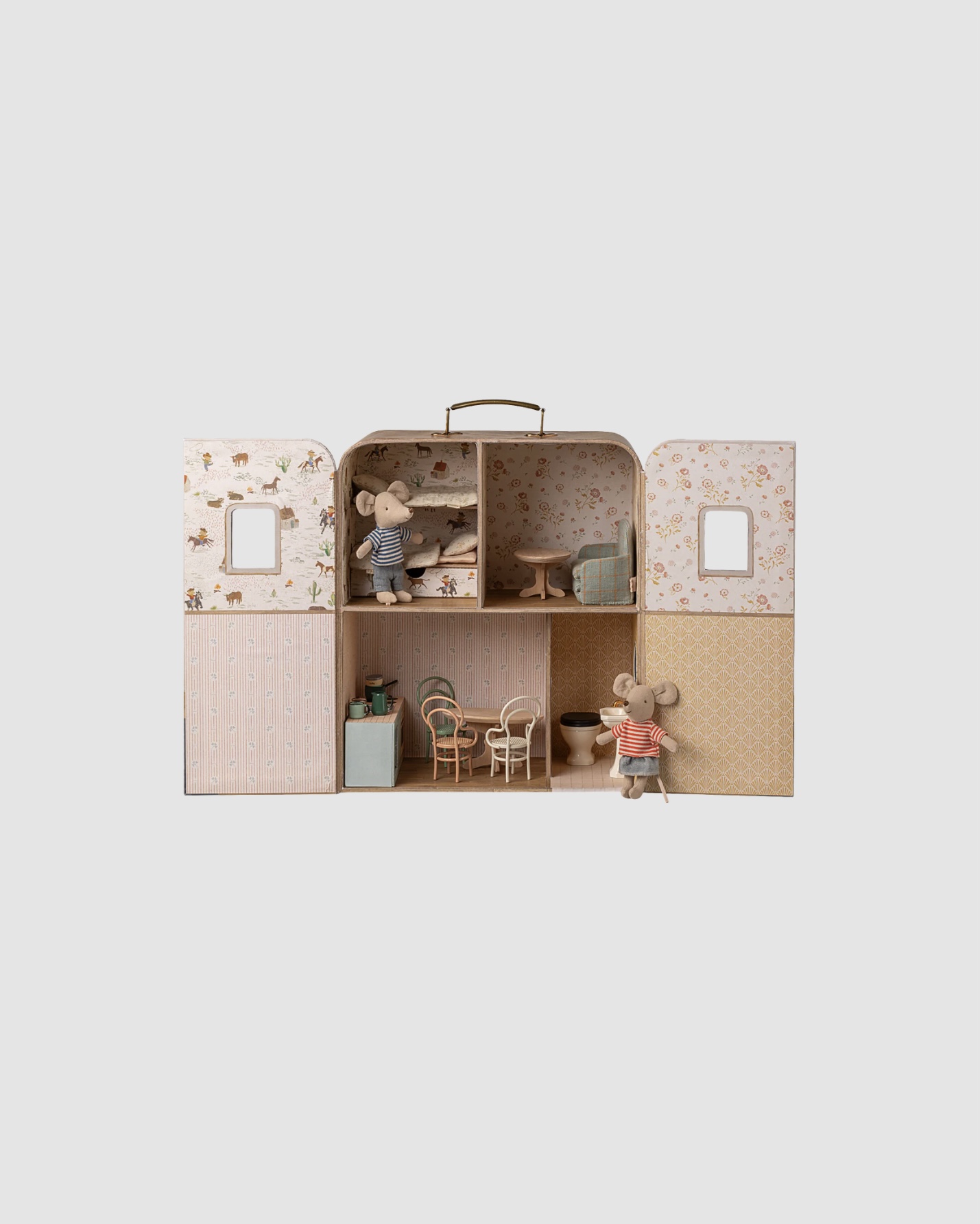 La Maison SuitCasa Maileg accompagne les souris Petite sœur et Petit frère dans leurs histoires du quotidien. Son format valisette permet de transporter facilement la maison grâce à sa poignée intégrée, tout en protégeant l’univers de jeu.