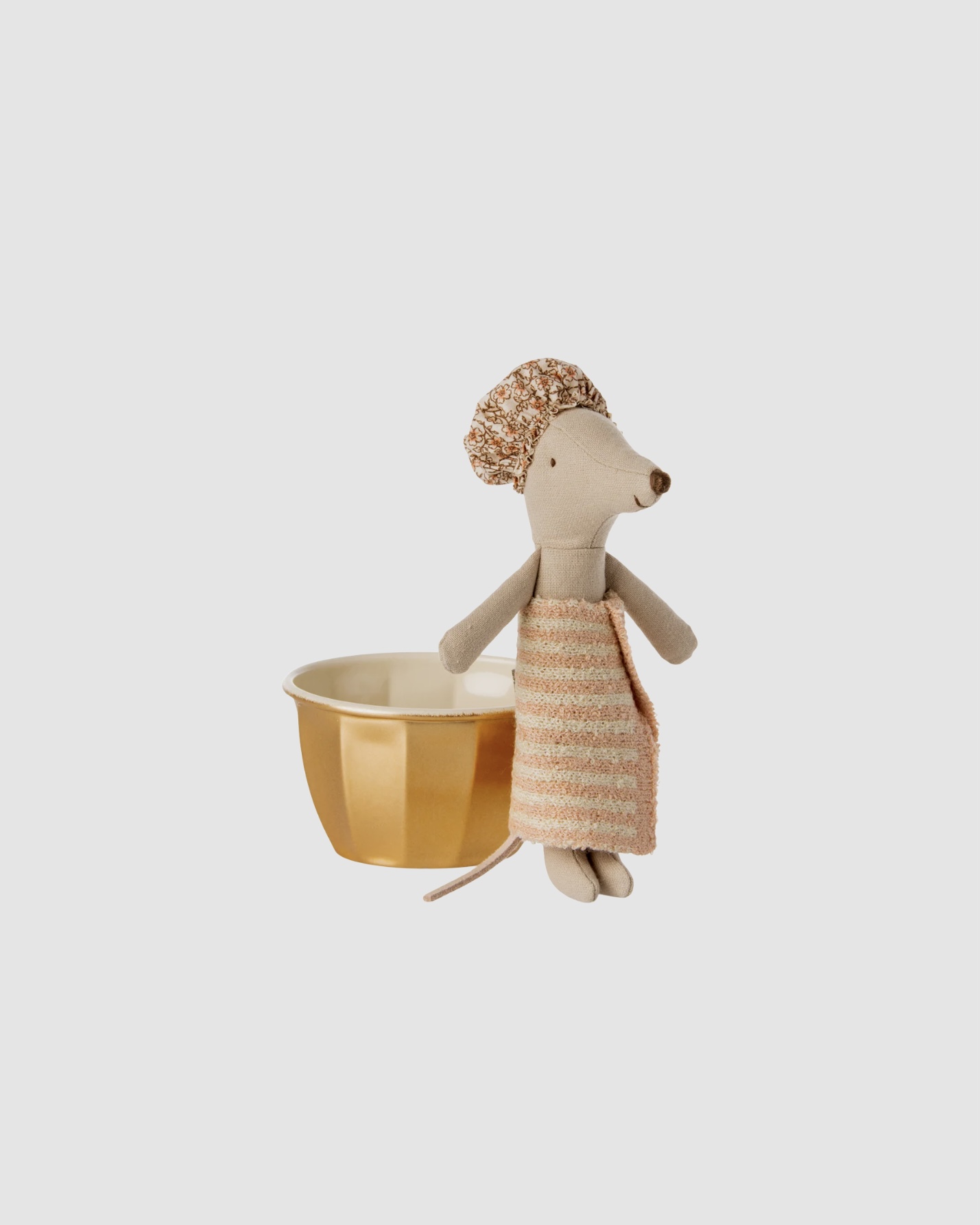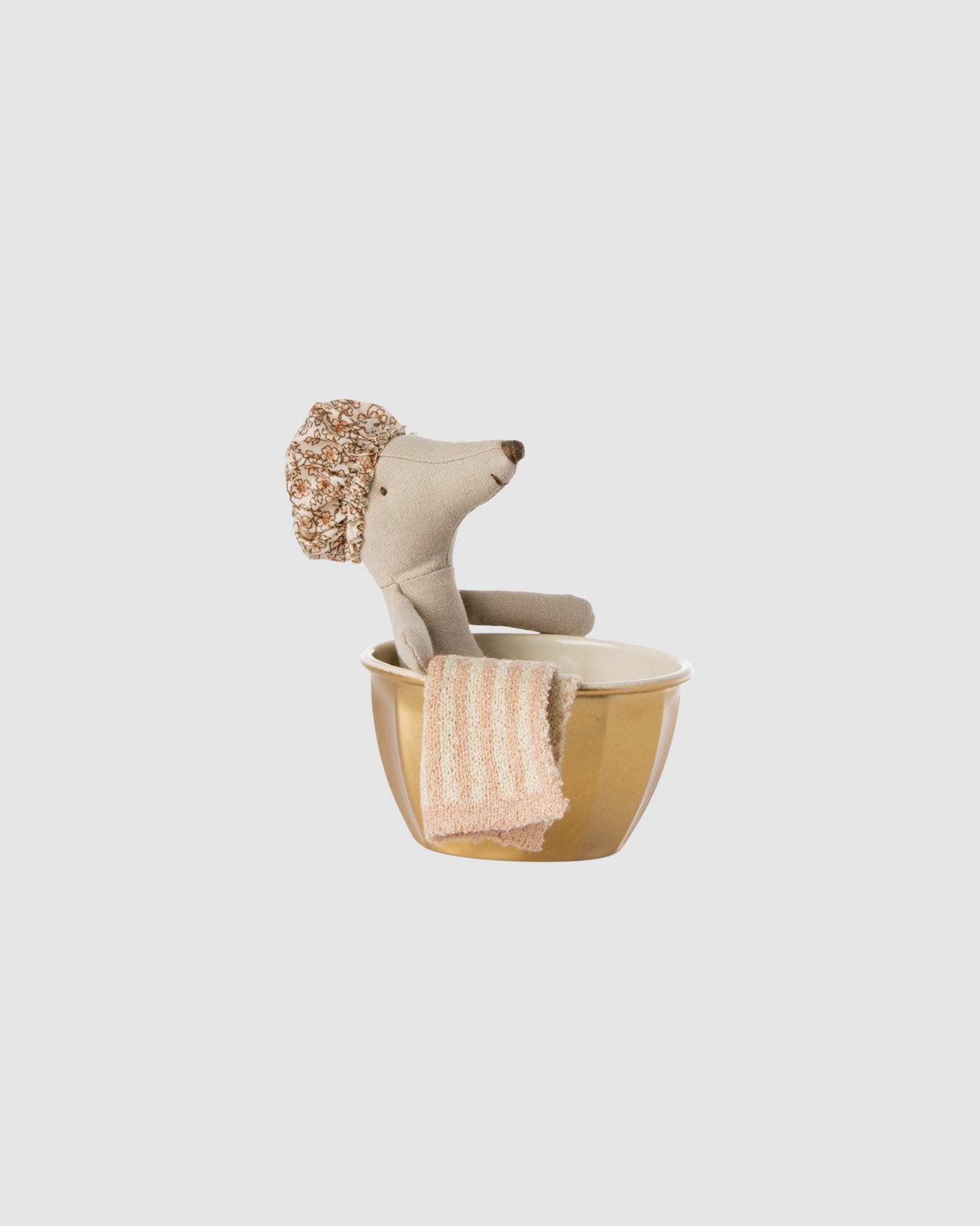 La grande sœur souris Maileg profite d’un moment de détente dans sa baignoire dorée. Avec son bonnet fleuri et sa serviette, cette scène miniature délicate enrichit l’univers poétique des petites souris.