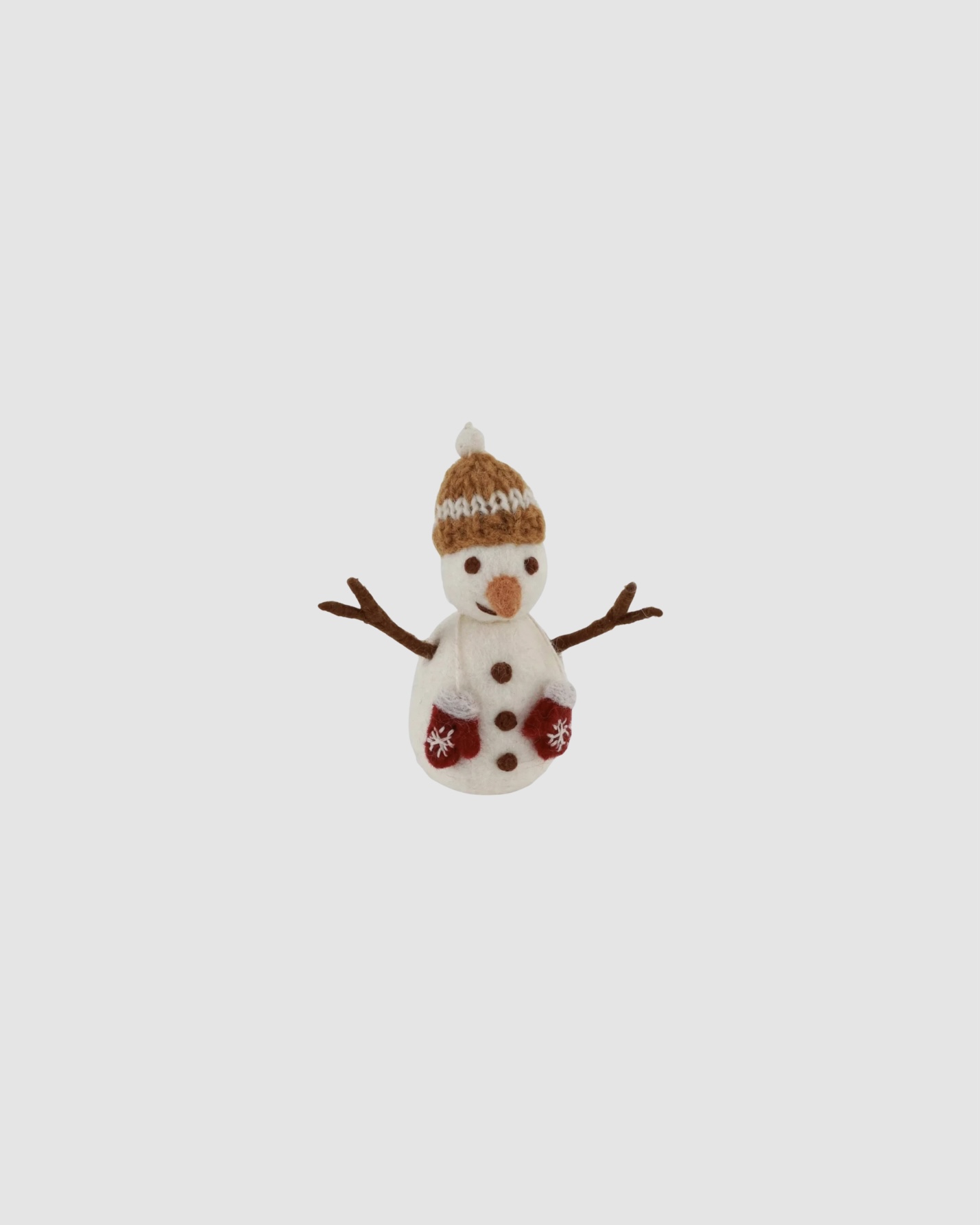 Ornement Bonhomme de Neige Gry & Sif en feutre, fait main au Népal. Une décoration de Noël douce, éthique et pleine de charme pour illuminer le sapin et la maison.