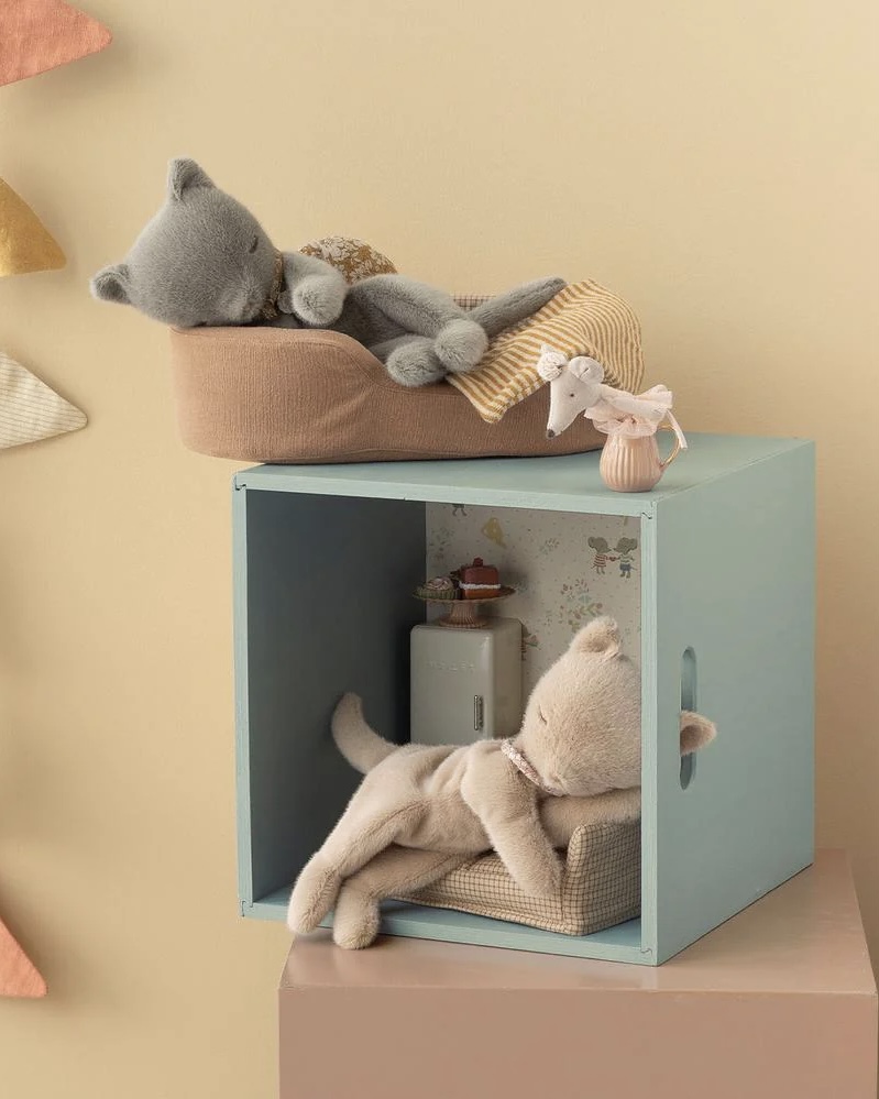 La peluche chaton Maileg est confectionnée dans une matière incroyablement douce, offrant un toucher unique qui invite immédiatement aux câlins. Sa posture endormie, délicatement travaillée, lui donne une présence apaisante qui plaît autant aux enfants qu’aux parents.