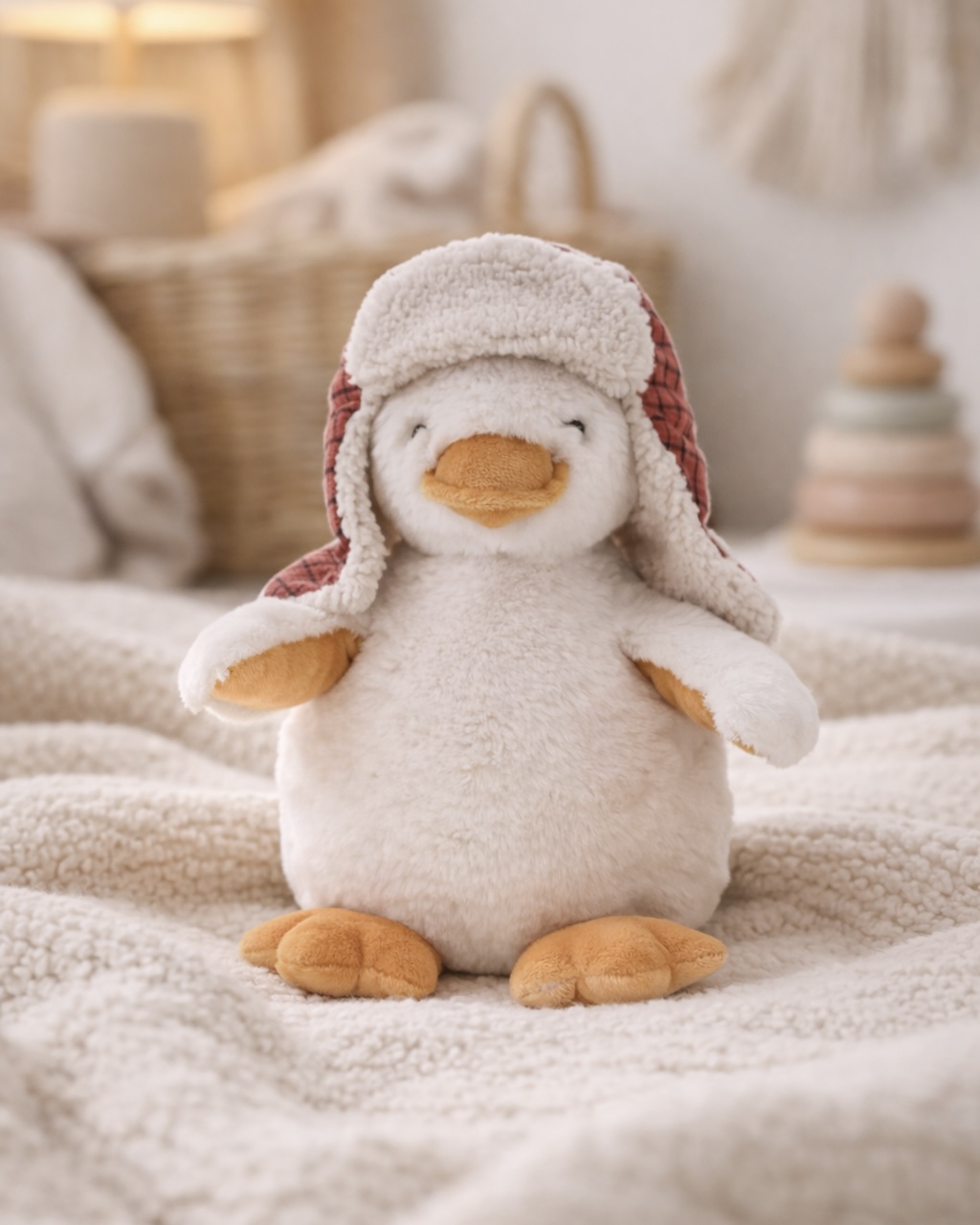 La Peluche Édouard le Canard Blanc Amadeus invite immédiatement à la tendresse. Avec son petit visage attendrissant, son plumage tout doux et son joli bonnet, elle devient vite un compagnon rassurant pour les tout-petits.