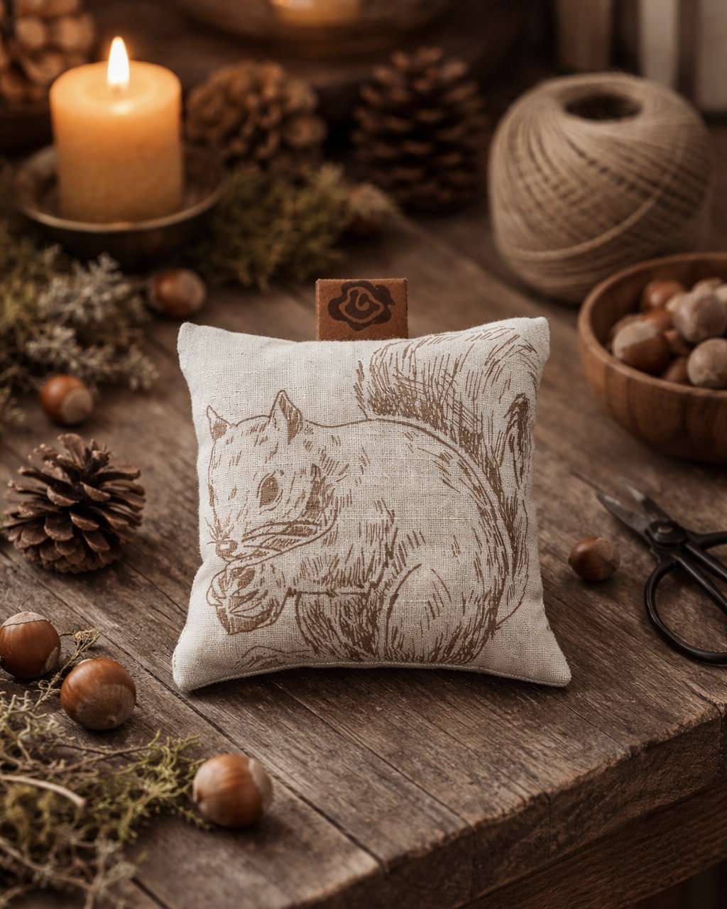 Le petit coussin parfumé écureuil imaginé par Dorothee Lehnen séduit par son esthétique délicate et son esprit intemporel. Confectionné en lin naturel, il est orné d’une illustration d’écureuil au trait fin, inspirée de l’univers de la nature et du design scandinave.