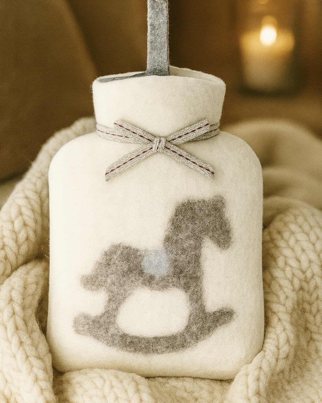 La Petite Bouillotte Cheval à Bascule Dorothee Lehnen apporte une chaleur douce dès les premières secondes. Son motif cheval à bascule, feutré à la main, lui offre un charme délicat et intemporel. Elle est conçue en pure laine mérinos certifiée GOTS. Cette matière naturelle assure une texture très douce et agréable. Son style épuré s’intègre facilement dans toutes les pièces.
