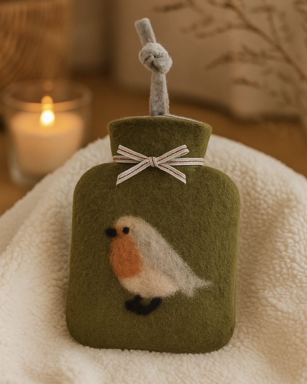 Cette bouillotte se distingue par son motif poétique. Le petit rouge-gorge, appliqué en laine, ajoute une note chaleureuse et hivernale. Ce détail artisanal donne à chaque pièce un caractère unique. Par ailleurs, la fabrication en Allemagne suit un savoir-faire traditionnel. Cela garantit une finition précise ainsi qu’une qualité très durable.