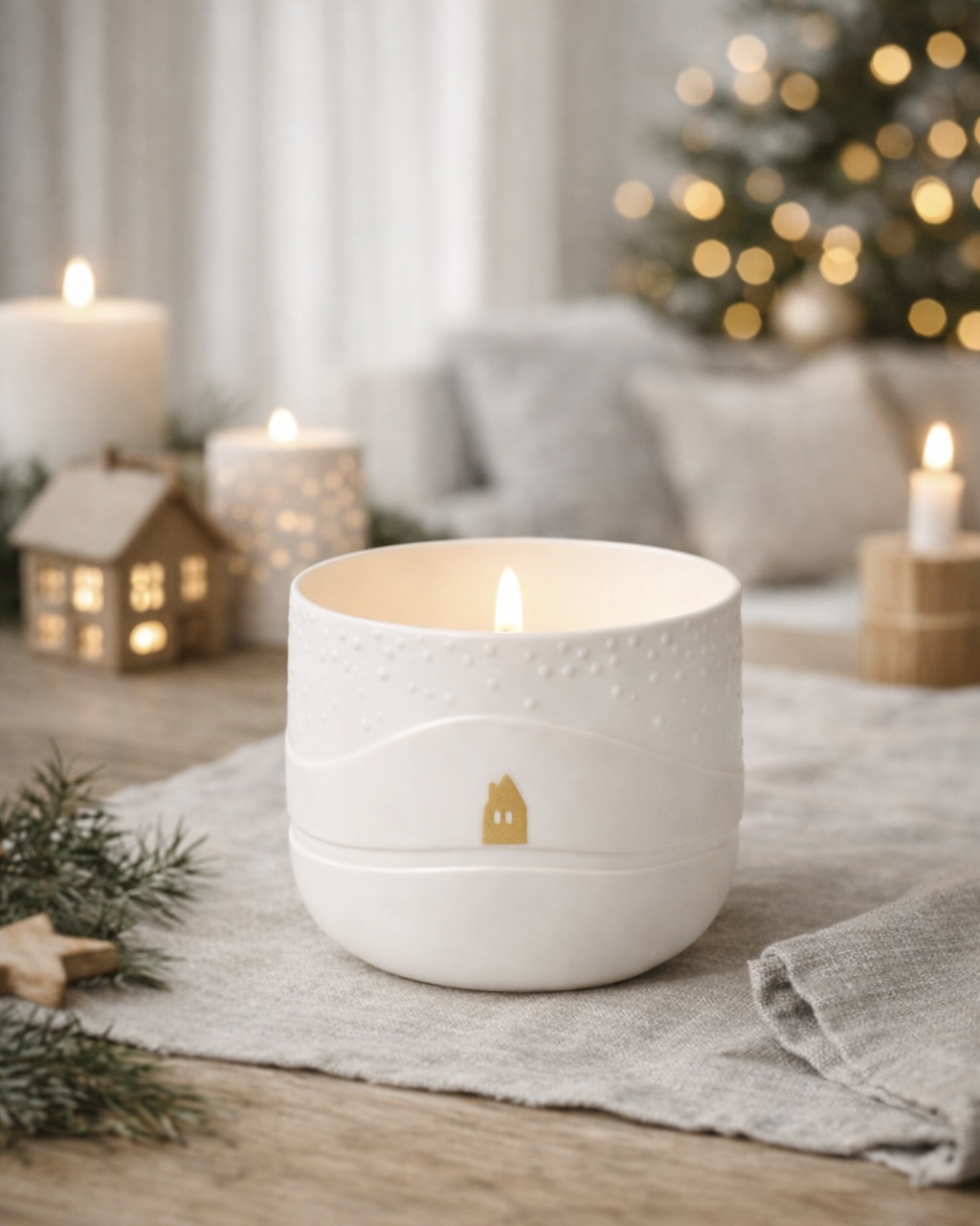 Le photophore Snowflakes de Räder diffuse une lumière douce et chaleureuse. En porcelaine blanche, il se distingue par ses reliefs délicats et sa petite maison dorée, emblématique de la marque.