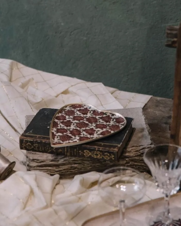 Chaque plateau est orné d’une bordure dorée réalisée à la main, ce qui rend chaque pièce subtilement unique. Cette finition artisanale renforce le caractère précieux de l’objet tout en conservant une grande douceur visuelle. Par conséquent, le plateau cœur Boncoeurs s’intègre aussi bien dans un univers romantique que dans une décoration plus contemporaine.