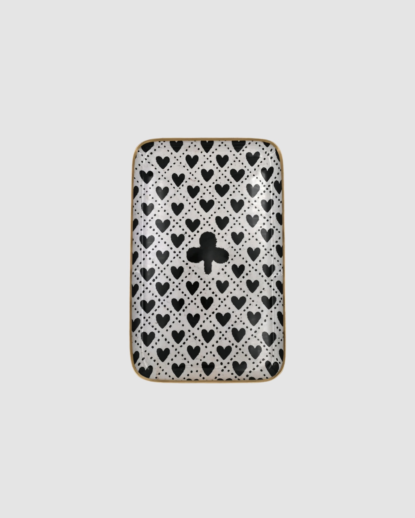 Le Plateau Les Cœurs Boncoeurs est une création forte et élégante, pensée comme un véritable objet de décoration. Inspiré de l’univers des jeux de cartes revisités et de l’esthétique Ex-Voto, il met en scène une répétition de cœurs noirs qui attire immédiatement le regard.