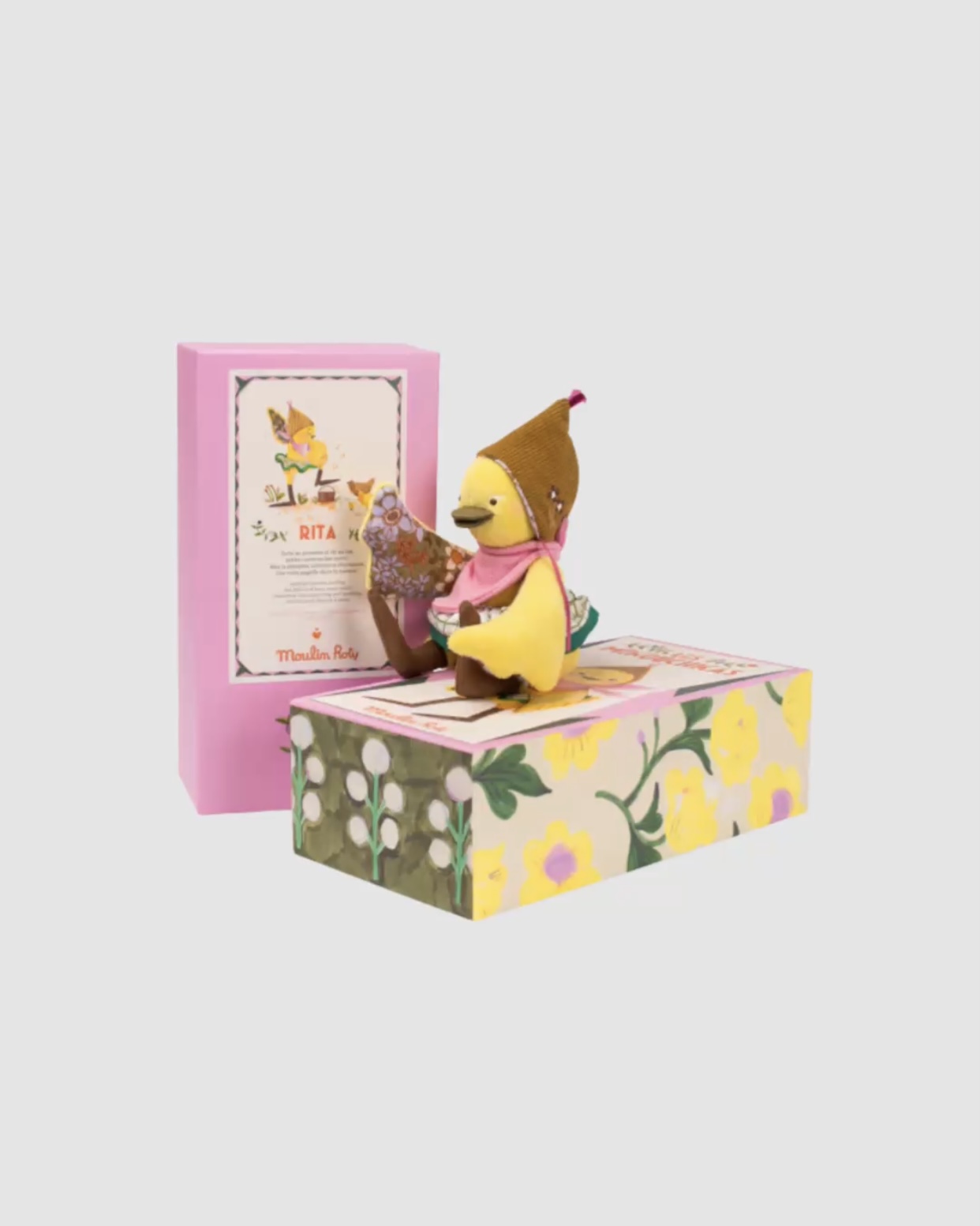 Rita est présentée dans une jolie boîte illustrée, qui peut aussi servir d’écrin de rangement ou de décor de jeu. Ce coffret, orné de fleurs et de détails peints, reflète tout l’univers poétique et artisanal de Moulin Roty, une marque française reconnue depuis plus de 50 ans pour la qualité de ses créations.