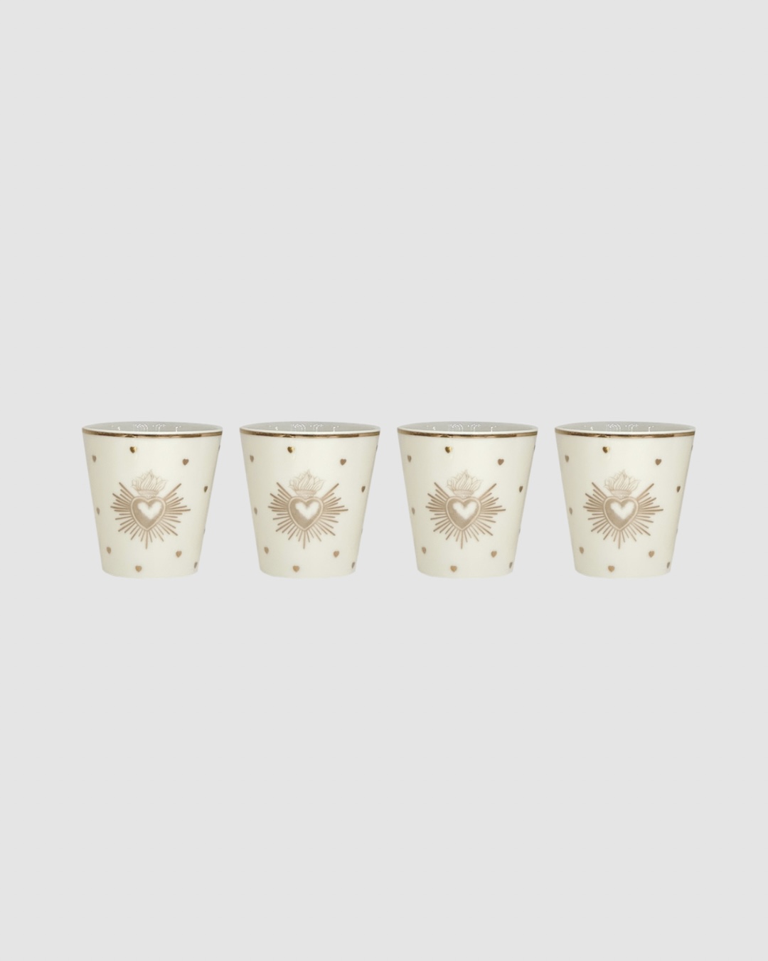 Sublimez votre table avec ce set de 4 gobelets Ex-Voto doré – Opjet Paris. En faïence fine, ils se distinguent par leurs motifs dorés délicats, mêlant raffinement et poésie.