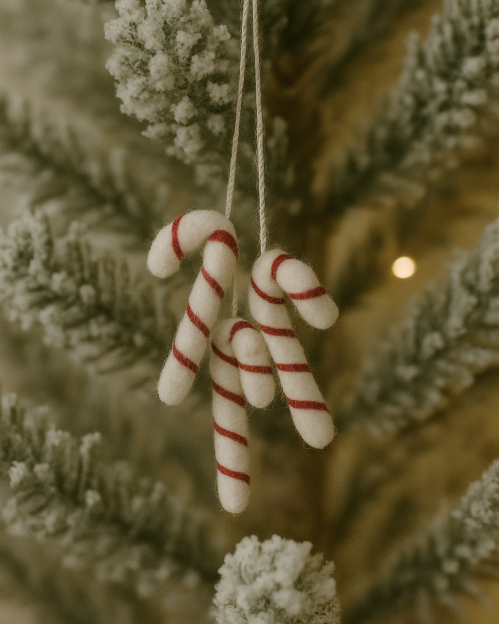 Ces ornements sont réalisés en laine naturelle de Nouvelle-Zélande. Cette matière offre une texture douce et une tenue parfaite pour une décoration de Noël durable. Le mélange de rouge et de blanc rappelle les traditions scandinaves, ce qui apporte une atmosphère chaleureuse et festive à votre intérieur.