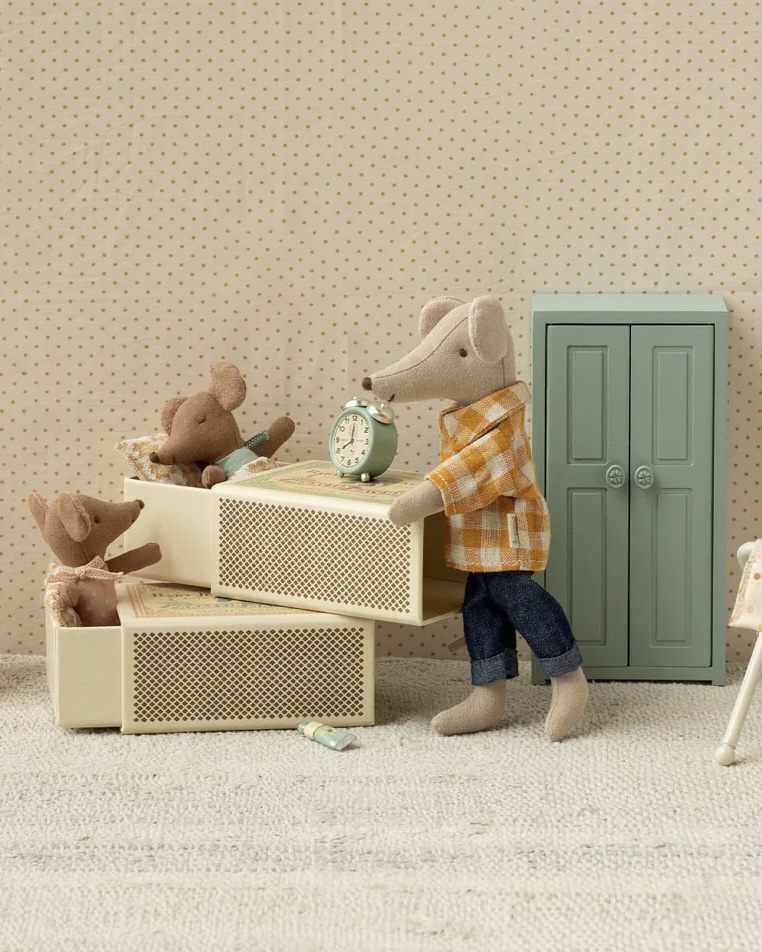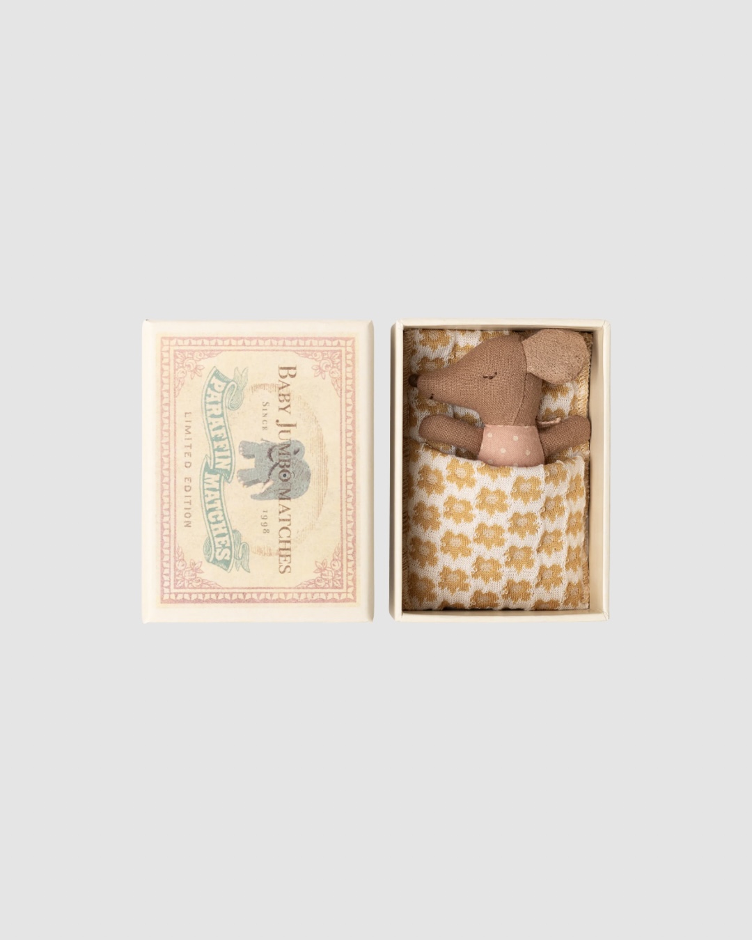 La Souris Bébé Sleepy Wakey Maileg séduit par son charme délicat et son univers empreint de poésie. Lovée dans sa boîte d’allumettes rétro, cette petite souris endormie invite les enfants à créer leurs propres histoires. D’un côté, ses yeux sont fermés, de l’autre, ouverts : elle alterne entre sieste et jeu selon l’imagination de chacun.