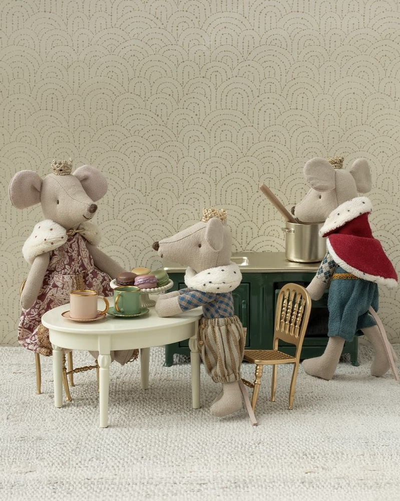 Pensée pour stimuler le jeu libre et narratif, la Souris Reine Maman Maileg invite les enfants à imaginer de grandes réceptions, des moments de vie au château et des histoires pleines de douceur. Grâce à sa taille adaptée, elle se manipule facilement et trouve naturellement sa place dans les décors Maileg. Elle peut aussi devenir un bel objet décoratif dans une chambre d’enfant, posé sur une étagère ou intégré à une mise en scène.