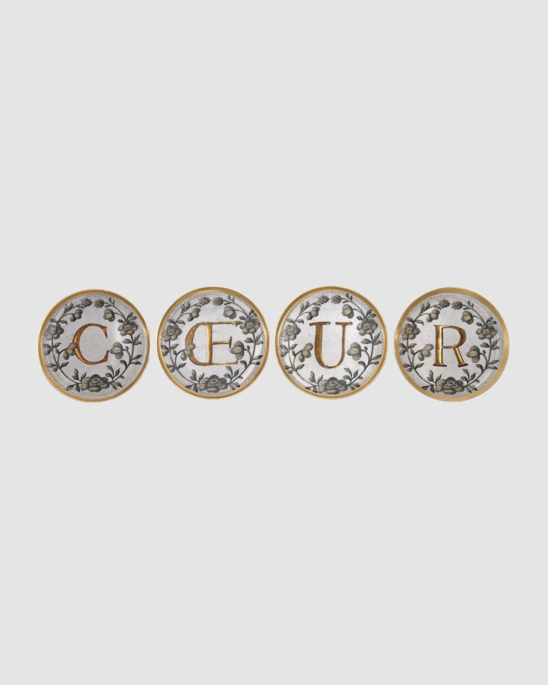 Un set de 4 sous-verres Enluminure Cœur signé Boncoeurs, en aluminium émaillé et bordures dorées à la main. Idéal pour protéger et sublimer votre table avec raffinement.