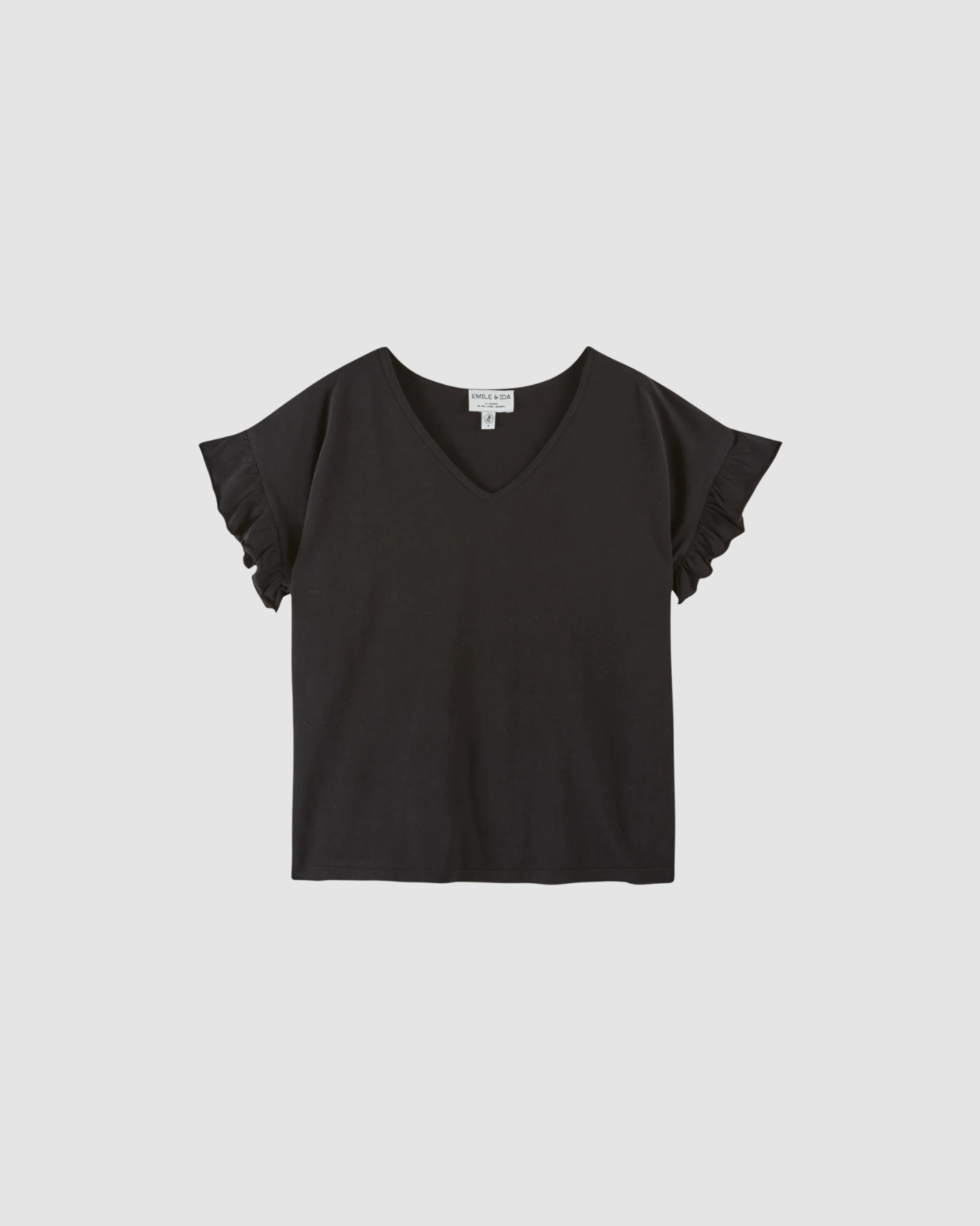 Le T-shirt col V volanté noir Émile et Ida séduit par sa simplicité élégante et son toucher particulièrement doux. Confectionné en jersey de coton biologique, il offre une sensation agréable sur la peau tout en conservant une belle tenue au fil du temps. Sa teinte noire profonde en fait une pièce essentielle du vestiaire féminin, facile à associer et adaptée à toutes les saisons.