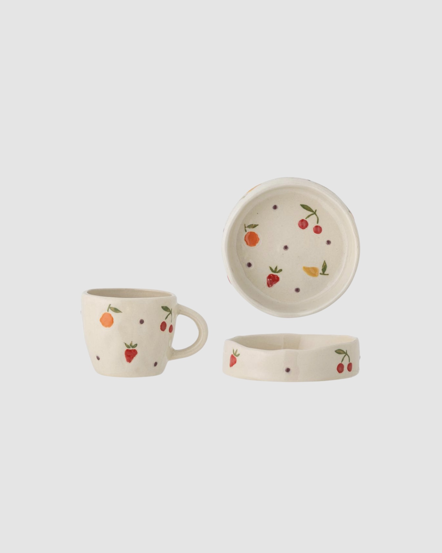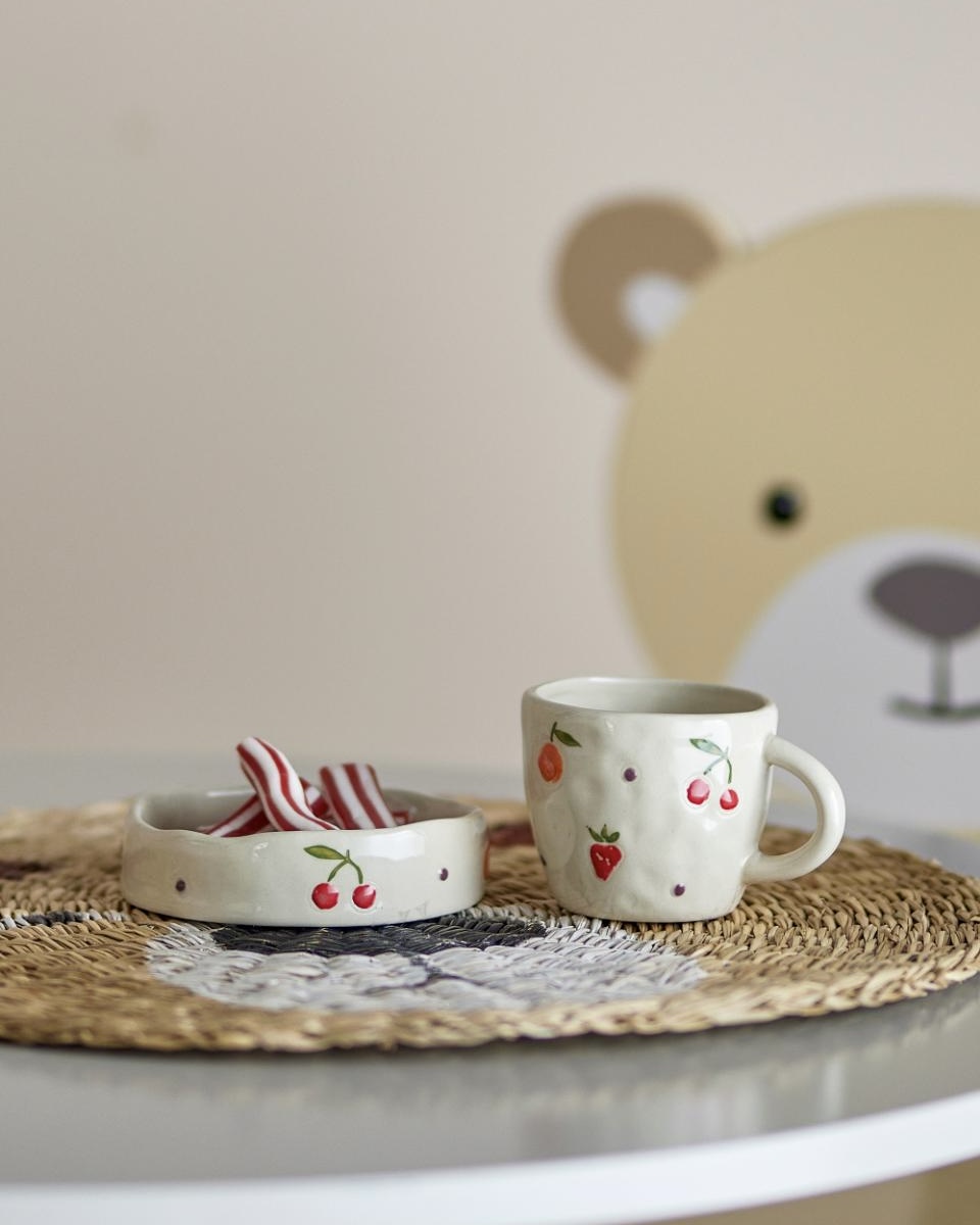 L’ensemble de vaisselle enfant Bloomingville Tatiana est composé d’une tasse et d’une petite assiette en grès, pensées pour accompagner les collations et les petits repas du quotidien. Grâce à son décor peint à la main, chaque pièce est unique. Les petits fruits colorés apportent une touche douce et joyeuse qui plaît autant aux enfants qu’aux parents.