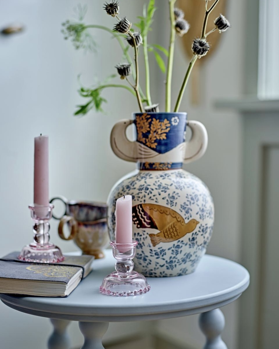 Le Vase Hezha Bloomingville est une pièce décorative unique qui attire immédiatement le regard. Réalisé en grès et décoré à la main, il se distingue par son oiseau en plein vol entouré de motifs végétaux délicats. De plus, son col bleu profond, orné de feuillages dorés et de fleurs, apporte un contraste élégant qui met en valeur l’ensemble de la silhouette.