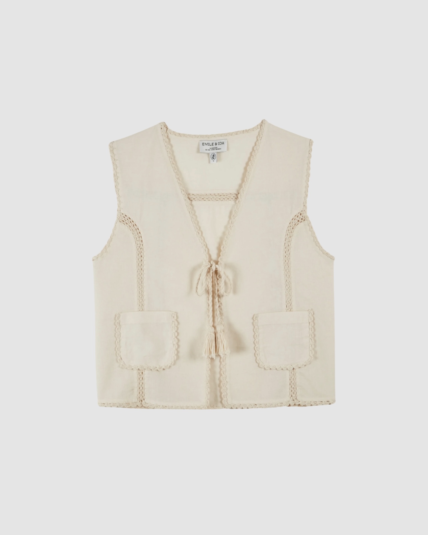 La veste sans manches crochet écru femme Émile et Ida peut être portée ouverte ou nouée sur le devant grâce à ses liens terminés par de petites franges. Elle se glisse facilement sur une blouse, une chemise ou une robe.